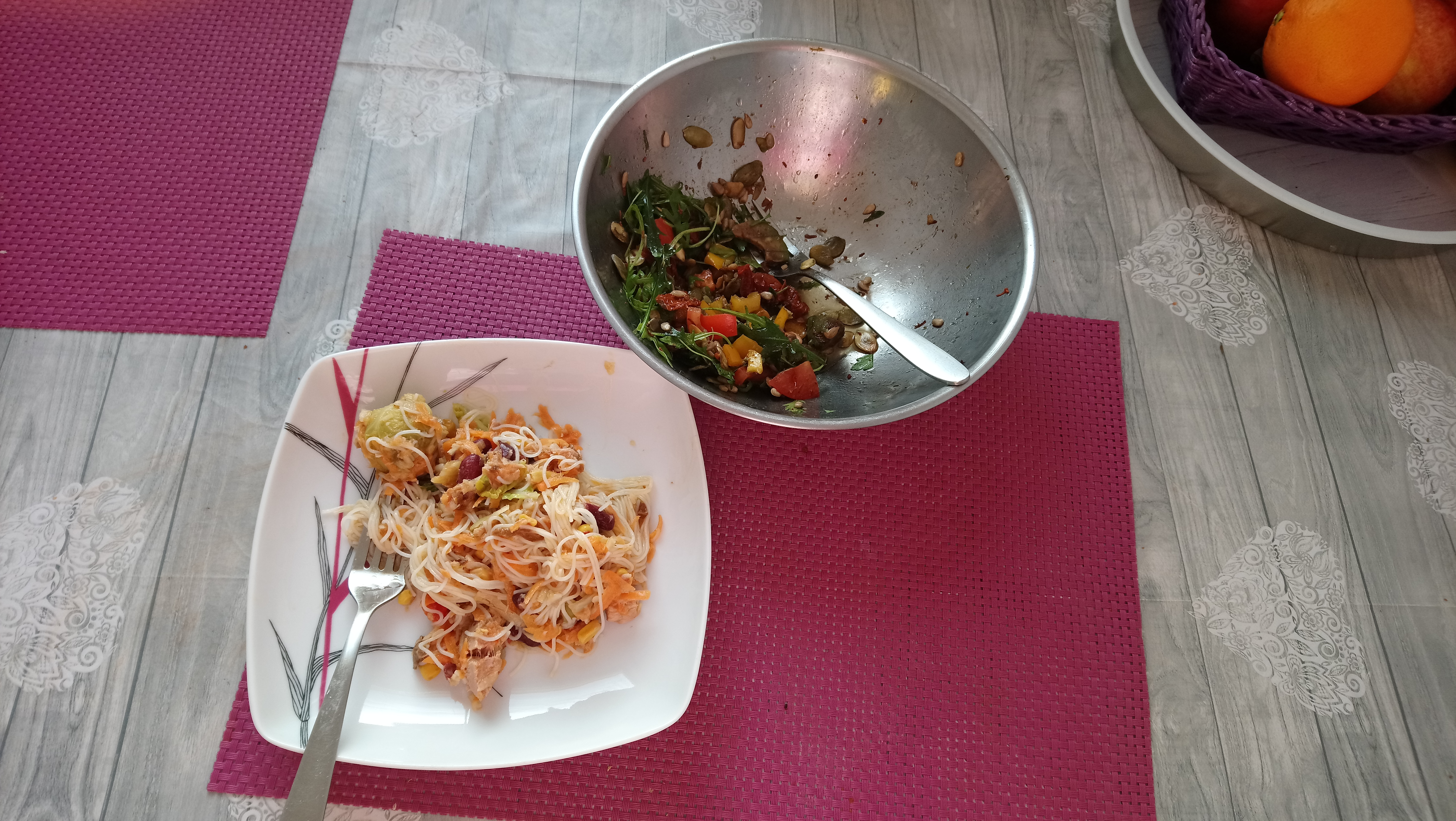 Także po raz kolejny pokazałam, że potrafię zrobić „coś [prawie, że] z niczego”, oczywiście jestem świadoma tego, że z całą pewnością nie smakowało to, tak jak rzeczywiście powinno, ale przecież najważniejsze jest to, że mi się udało! I że po raz kolejny coś wymyśliłam, a jest przynajmniej oryginalnie! 🤣 Na ostatnim zdjęciu jest właśnie ten mój obiad na talerzu, a obok stoi sałata, którą dla siebie także przygotowałam, ah…