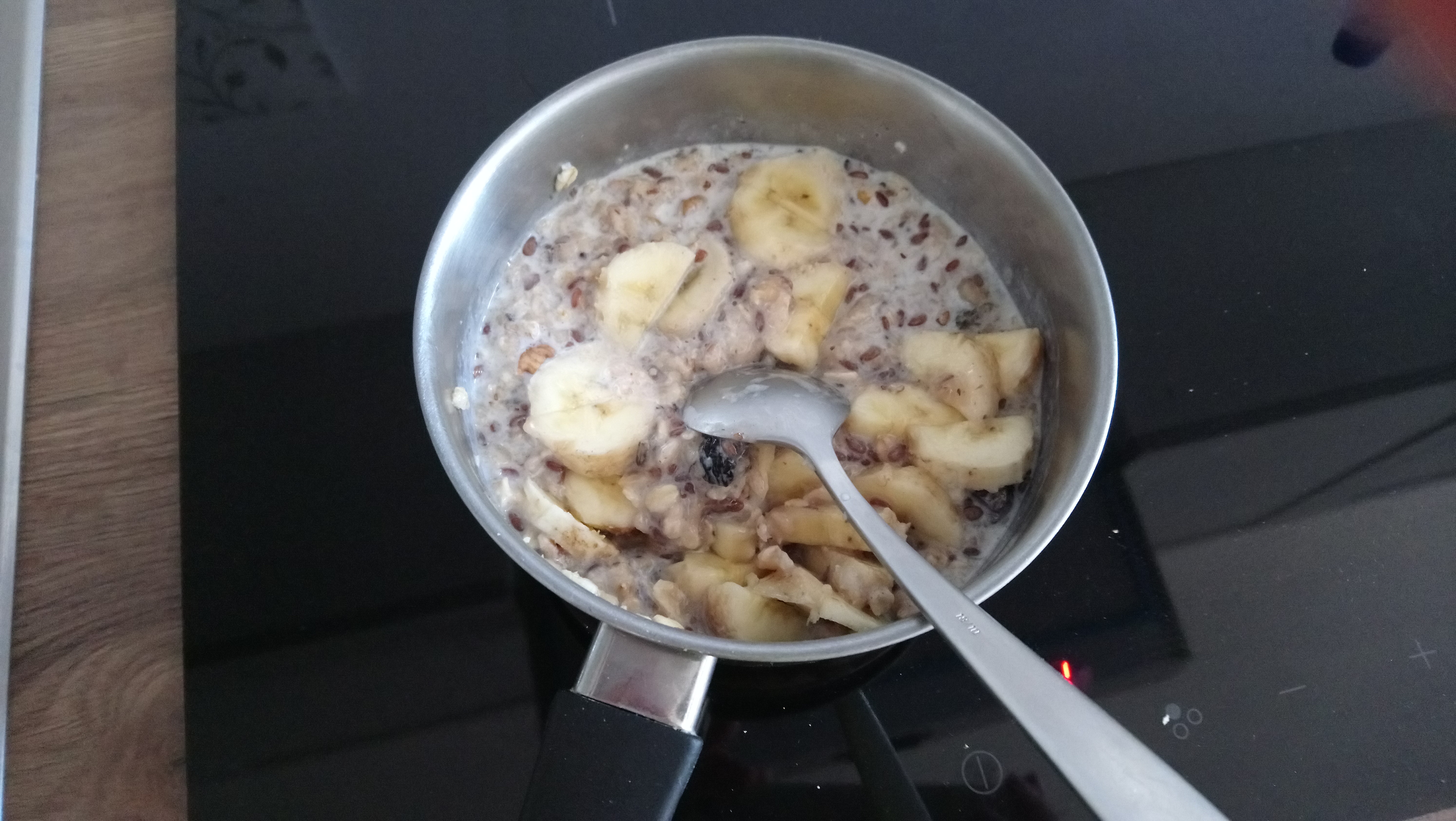 Robię jednak i z mlekiem i bez, tu dodałam je dopiero na sam koniec, jak i banana i orzechy.