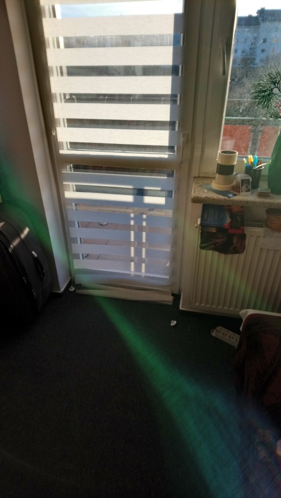 I co zrobiłam? Bezmyślnie otworzyłam szeroko balkon, zapominając, że zamontowane mam tam w ten sposób rolety, że nie mogę po prostu AŻ TAK SZEROKO OTWIERAĆ TYCH DRZWI BALKONOWYCH.
