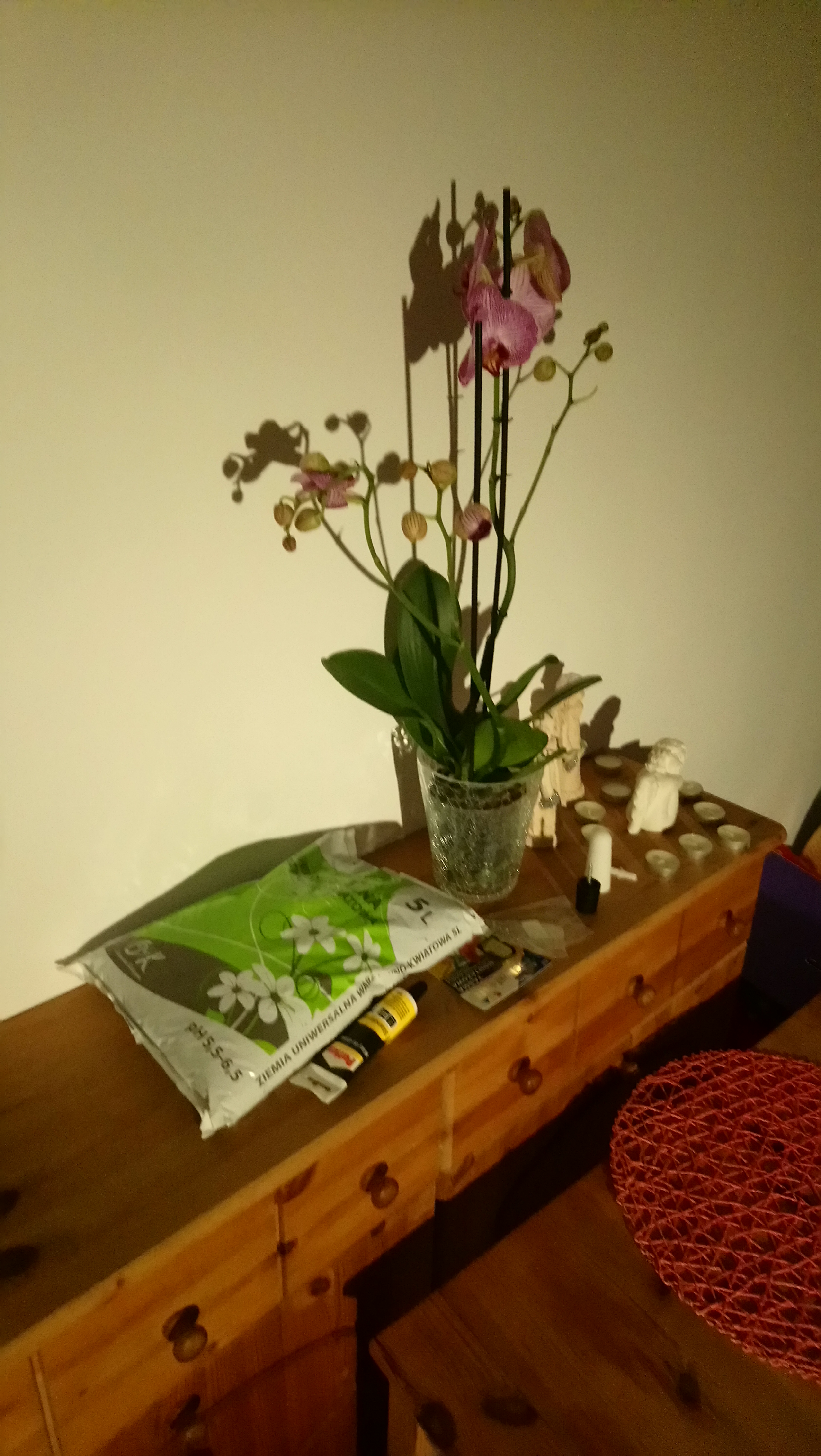 Jeszcze jest czwartek 14.03.19 już myślałam, że ten znajomy nie przyjedzie, ale wpadł do mnie ze swoją żoną Asią i synkiem Piotrusiem, tak późno, bo dopiero wracali od jego teścia, gdzie byli na urodzinach. I mam już naprawione te rolety, i dobrze mi powiedziała dziewczyna z Castoramy, że skoro tylko przy otwieraniu drzwi balkonowych one mi się po prostu „rozsunęły”, to zapewne należy je tylko dobrze złożyć i wcisnąć. Andrzej kiedyś pracował w Castoramie właśnie na dziale rolet, zatem doskonale to wiedział i mi naprawił. Zakupiłam także odbojnik [a właściwie 2 różne, bo drugi na drzwi od lodówki, by nie obijały o ścianę 😉], także klej [by móc sobie posklejać szuflady w moich cudnych komódkach] i w razie co wzięłam także taśmę dwustronną [gdyż nie byłam już pewna, czy może czasem się nie przyda jednak do tych rolet😋].A na ostatnich fotkach widać także mój piękny storczyk, który sobie zakupiłam, a później dokupiłam do niego doniczkę i także wzięłam worek ziemi, do przesadzenia tego kwiata, któremu robię co tygodniową „kąpiel” i któremu zakupiłam już przecież tą większą doniczkę.