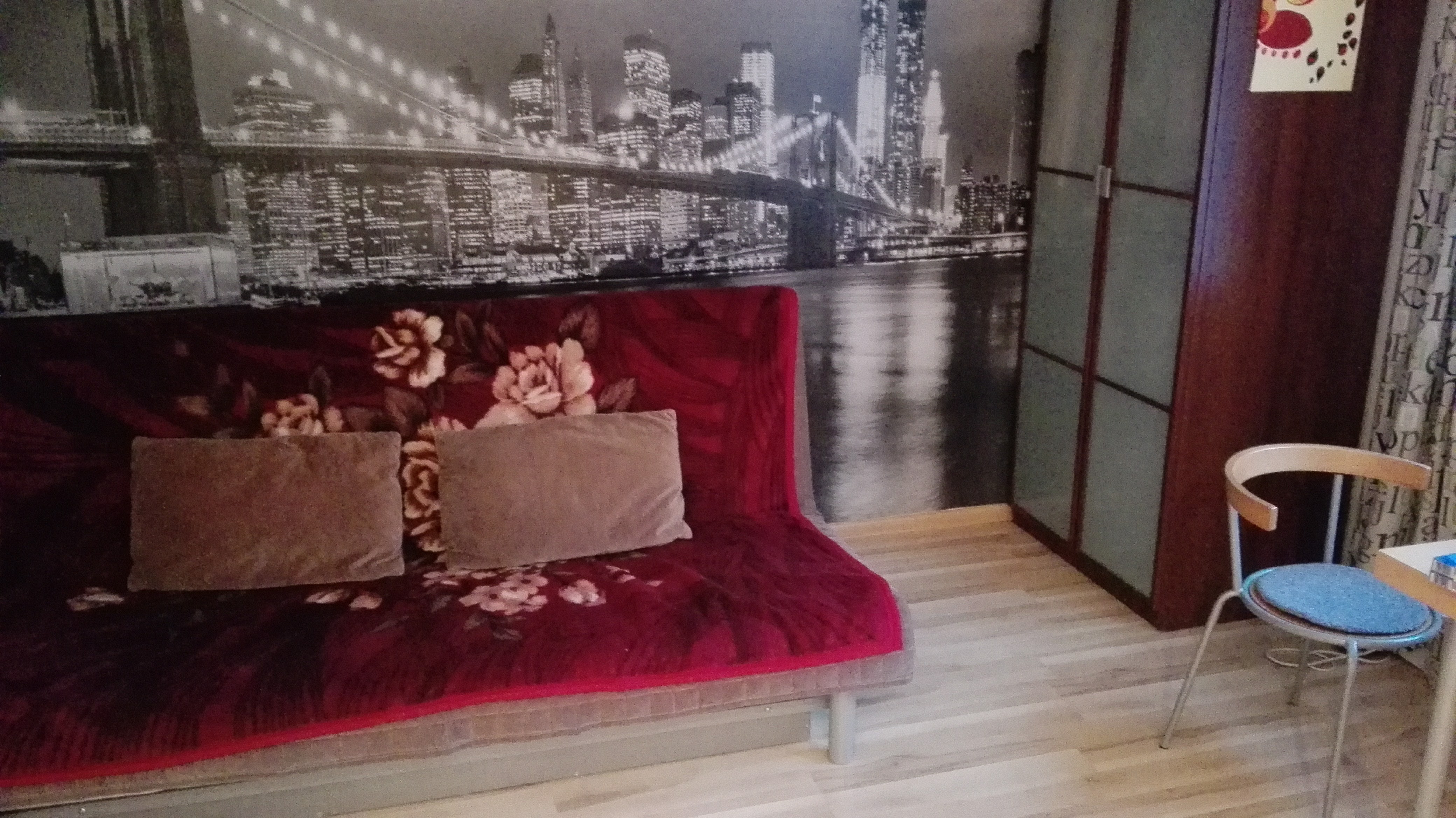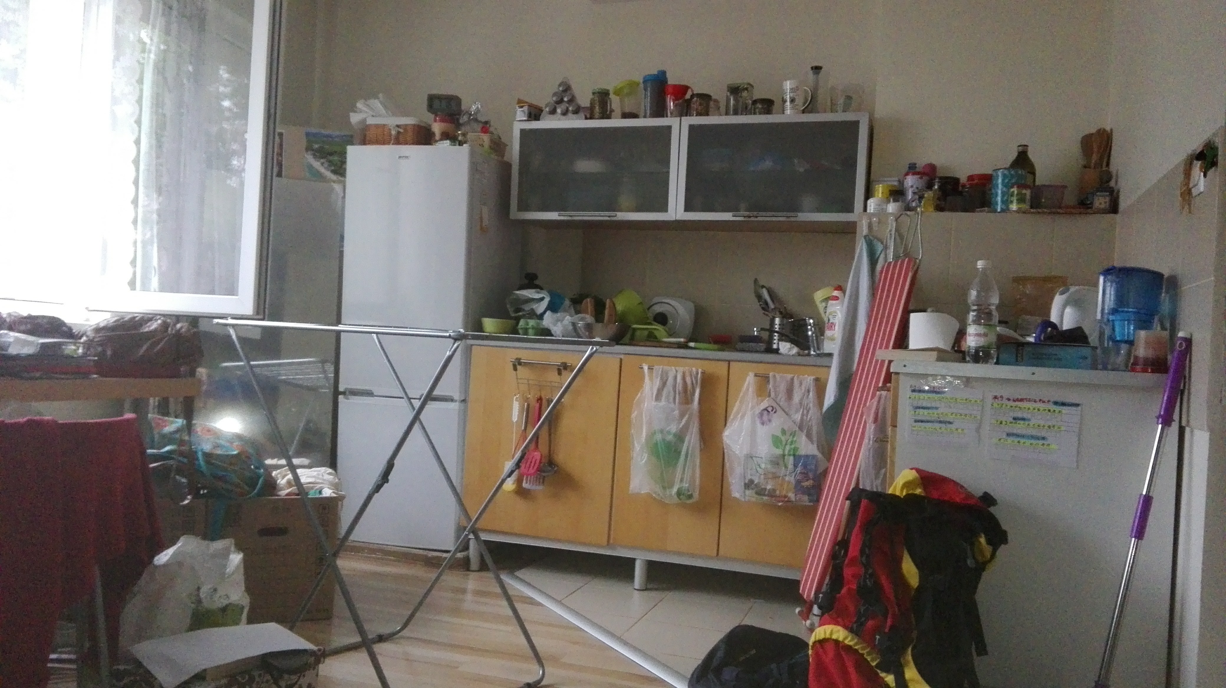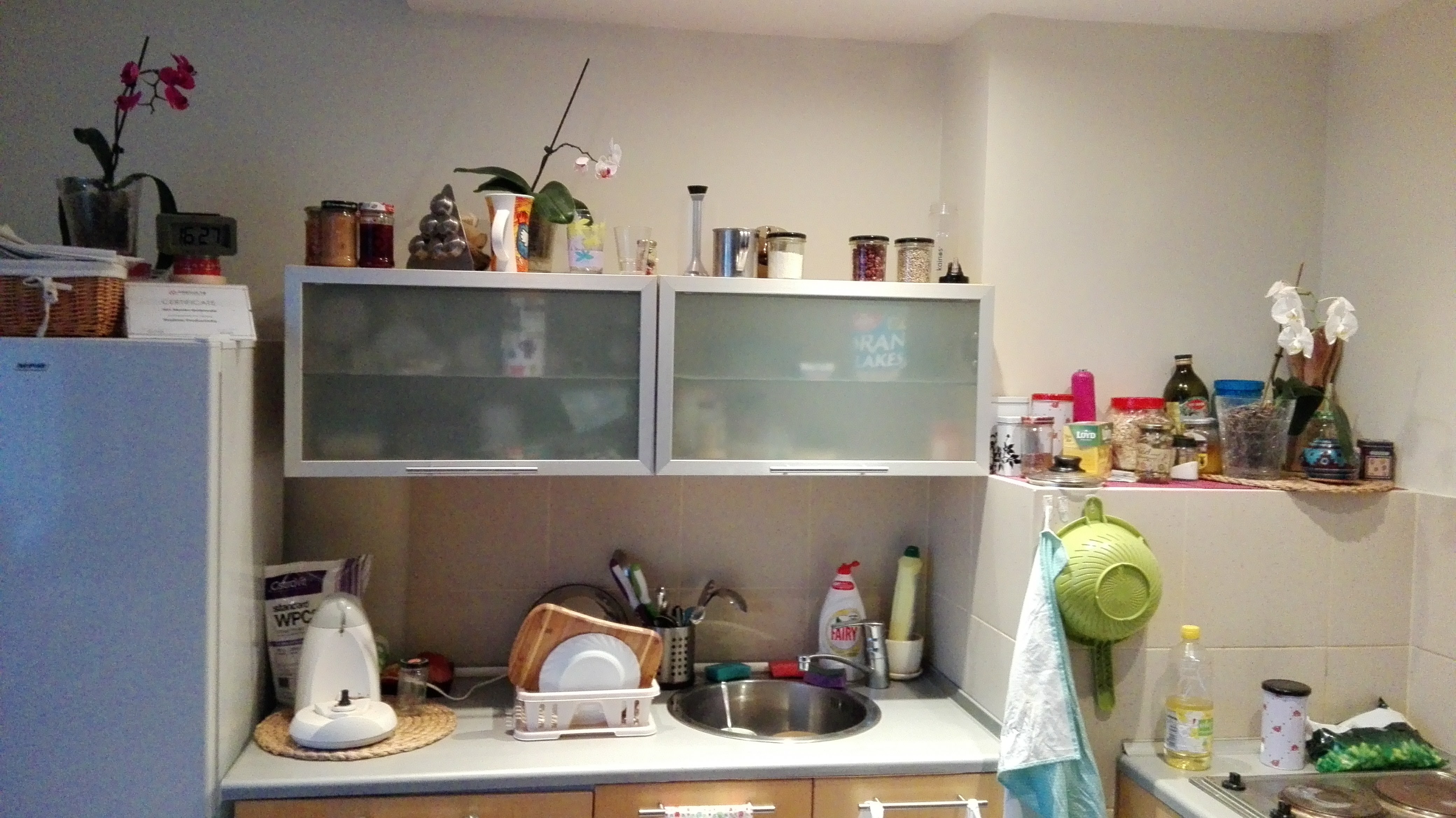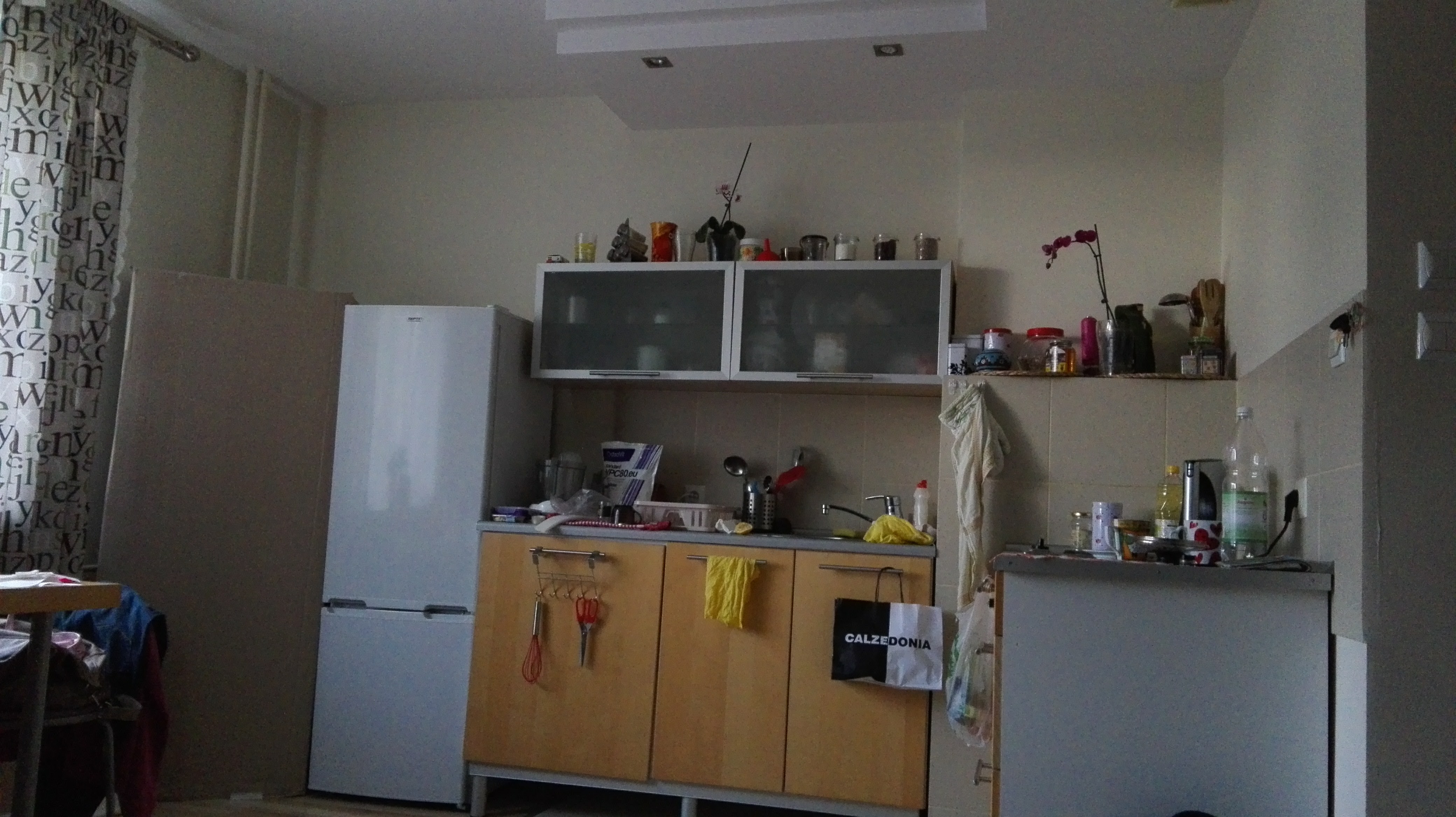 - [na fotkach poniżej- znalazła jeszcze w swoim telefonie – zdjęcia tego właśnie swojego lokum, jednak wiedzcie, że na początku wcale ono tak nie wyglądało: nie było szafy, lodówki, suszarki do naczyń i tej do suszenia ciuchów, nie było nawet wszystkich podstawowych naczyń…obrazki, kwiatki, koc na wersalce = są także jej własnością]