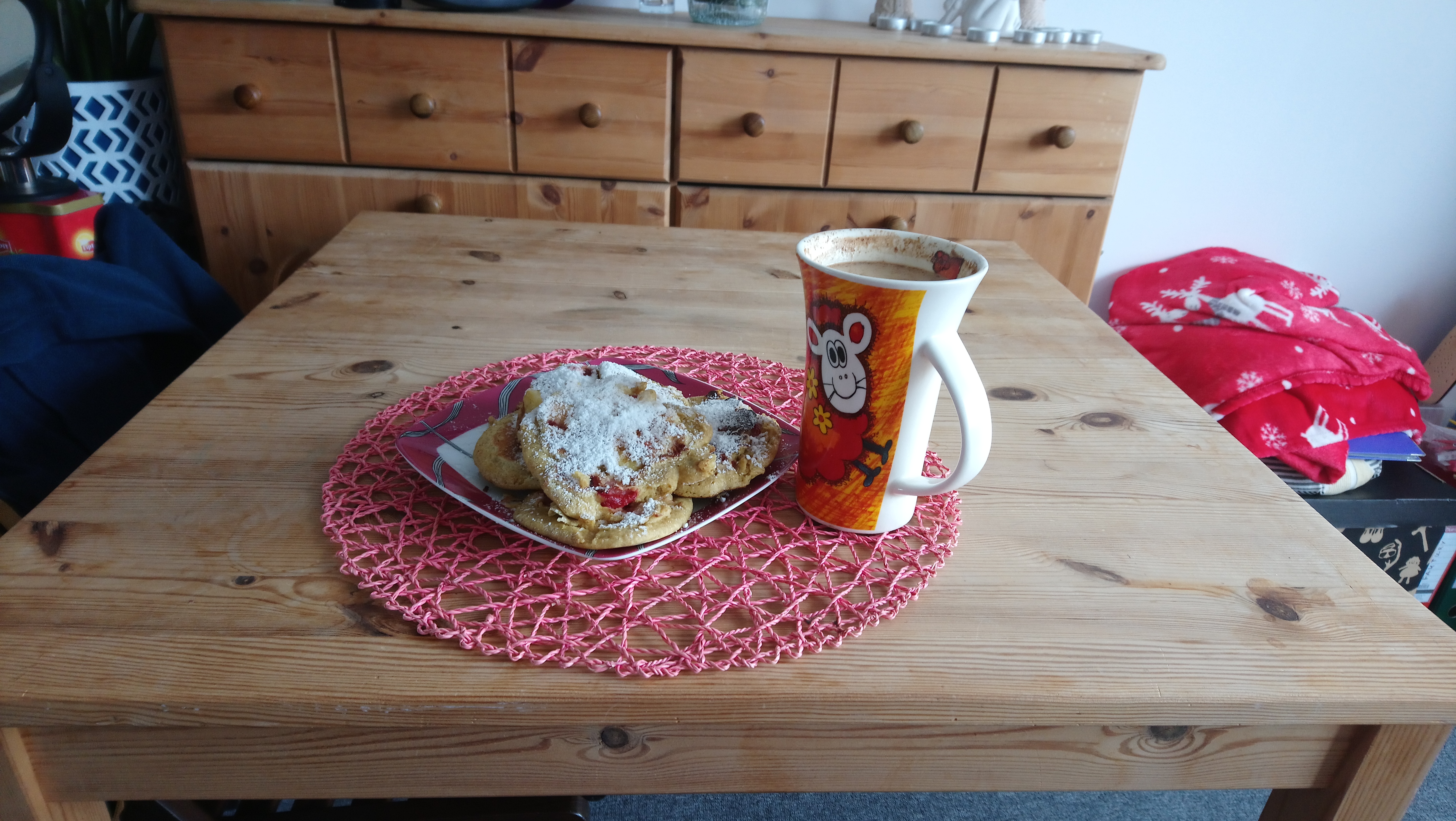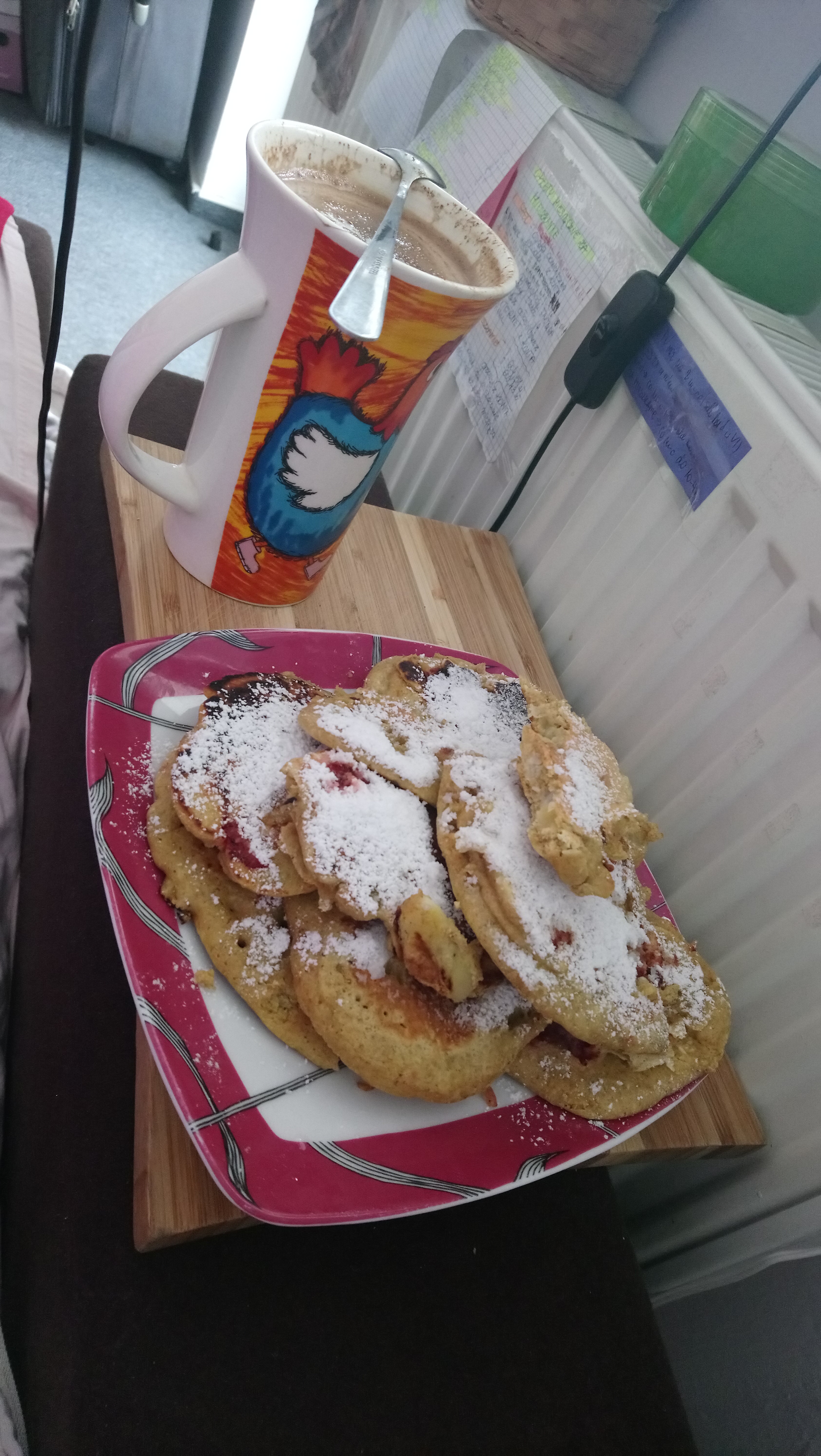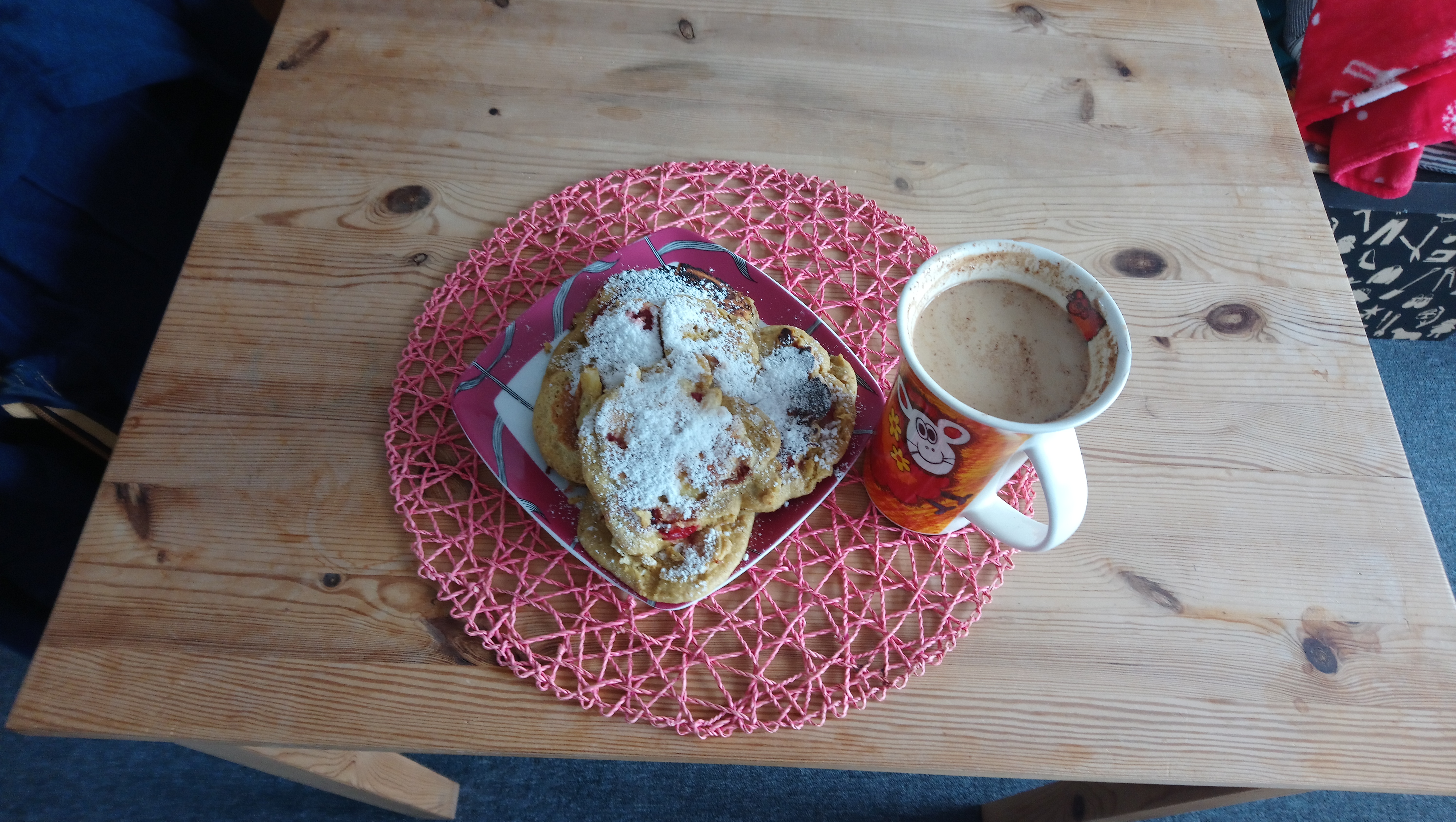 Zatem po jej zjedzeniu dalej siadła tu i „dziergała” nad tym swoim wpisem. Była już chyba prawie 15, pomyślała, że wypije sobie kawę i a miała taką ochotę na banana, którego sobie również zakupiła w tym warzywniaku, wracając z InPost. Lecz za chwilę pomyślała sobie, że bardziej chciałby sobie chyba jednak zjeść placki. Zatem zaczęła je przygotowywać i smażyć, a dodała tam [prócz banana także kilka truskawek], w ogóle nie za bardzo wciąż wie, co do czego pasuje, a niestety sprawdzić też nie może, bo… [a tylko przypominam, że na własnych kubkach smakowych nie może już raczej oddanie polegać 😋]