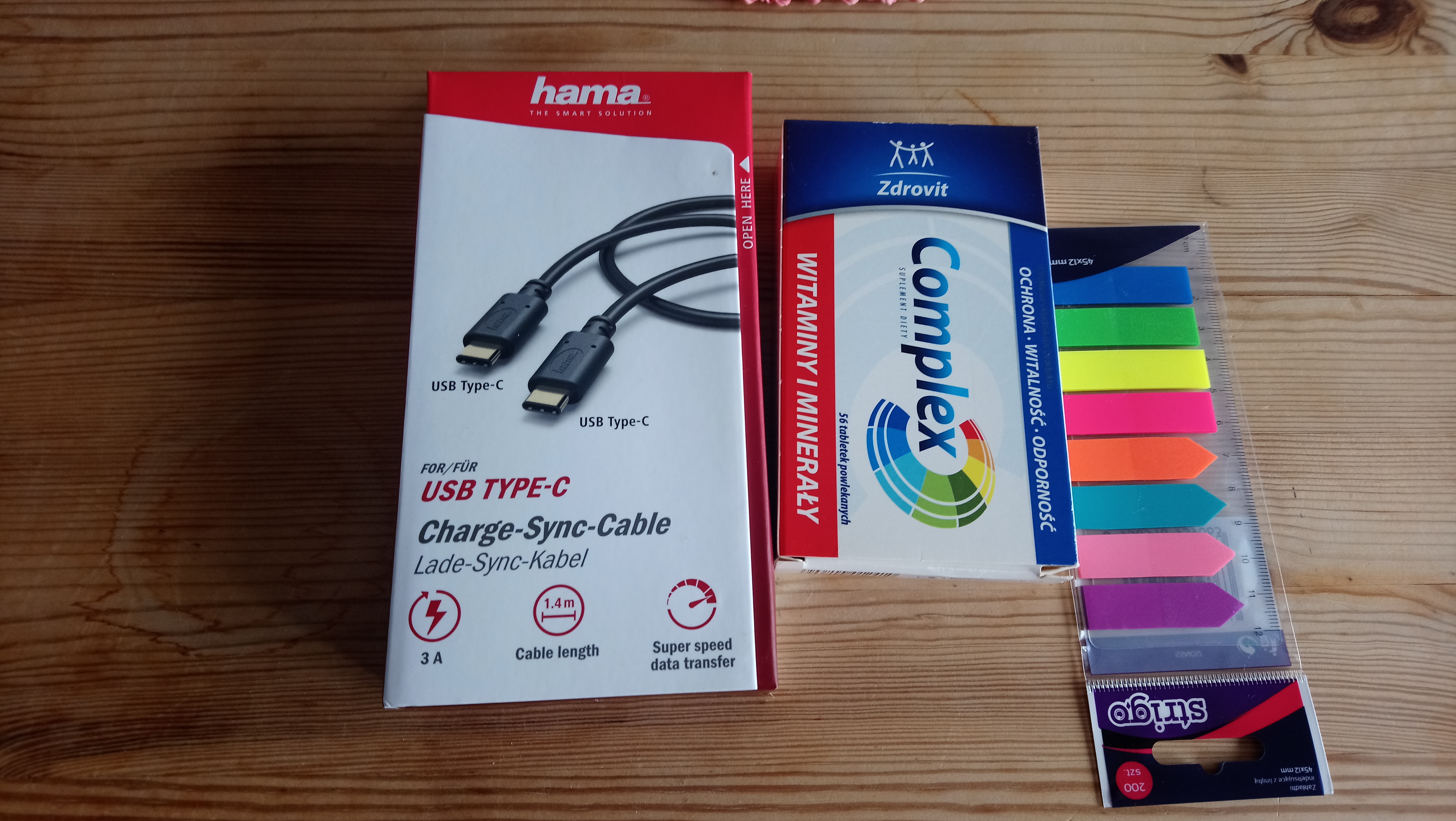 Poniżej widać już na tym zdjęciu, prócz tego rozwalonego kabla [po prawej, na pierwszej fotce], także to, w co się zaopatrzyła, czyli i nowy kabel do tej właśnie ładowarki i te „sticki” 😉