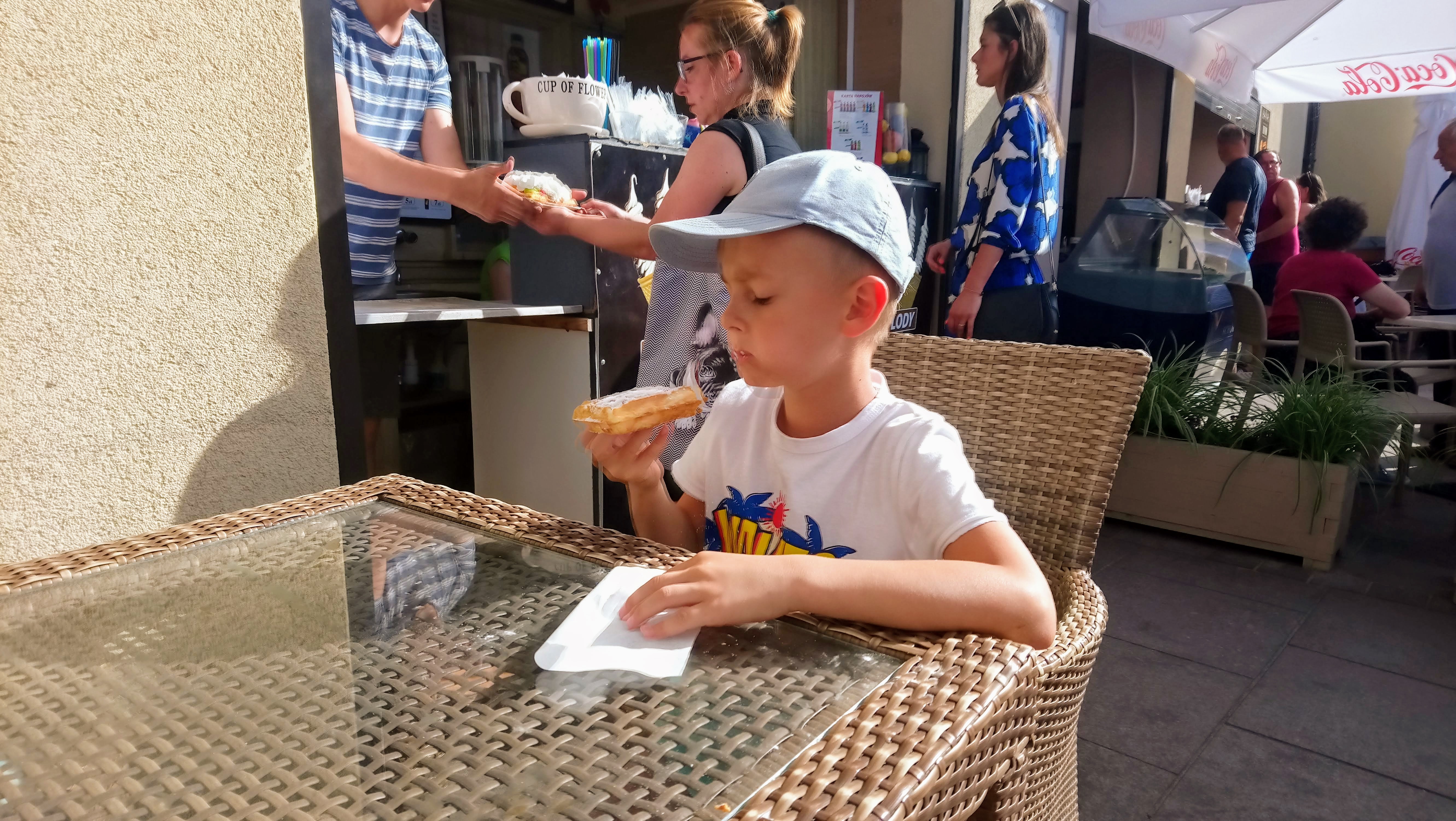 Jak dotarli do Sopotu, to pierwsze co, musieli poszukać oczywiście ubikacji, hehe, gdyż pęcherze ich już się napełniły 😋 [co swoją drogą wcale nie było takie znowu łatwe, tzn. znalezienie tej bezpłatnej toalety, czyli po prostu w jakimś lokalu, gdzie można by np. także zjeść loda, gofra itp. dopiero dalej na „Monciaku” okazało się, że tam są takie restauracje i knajpy], a ponieważ oni nie chcieli się jakoś oddalać od swojego celu [mola]. W końcu jednak udali się do płatnej toalety. Po czym zrobili sobie przerwę na loda, Kacpuś chciał gofra, a ponieważ, jak mówił, z duuużą ilością cukru pudru 😊 Miły chłopak obsługujący, po tym, jak gofr był już przygotowany, pokazał go Kacperkowi i zapytał, czy taka ilość wystarczy? Oczywiście ten „słodkolobny” bohater odpowiedział, że „za mało” 🤣 I pan w tym momencie podwoił mu ilość tej „posypki” 😜