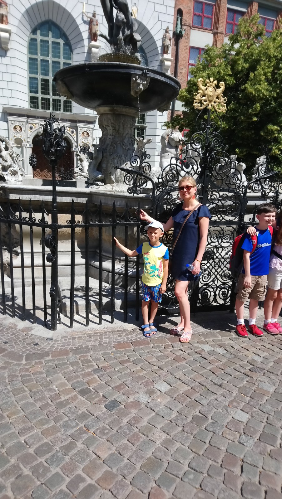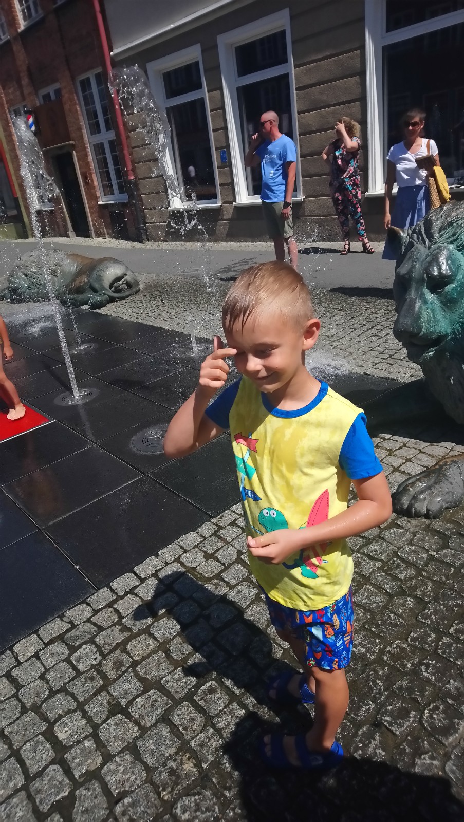 Wędrując dalej zobaczyli jeszcze fontannę, po której biegały i moczyły się dzieci, zatem oczywiście Kacpulek chciał także, a i one nie miały nic przeciw, aby ten ich szkrab miał trochę radości również tam.