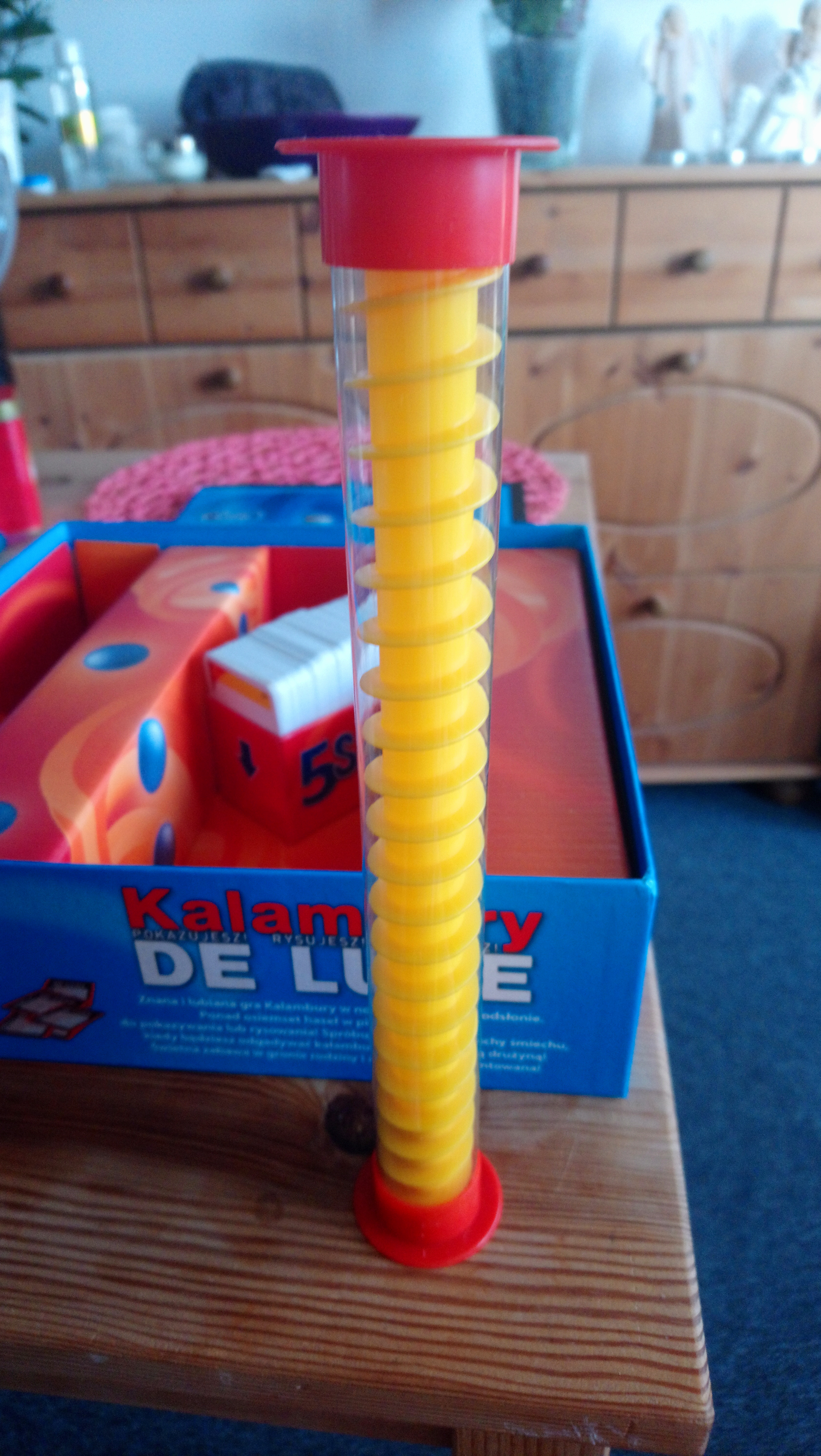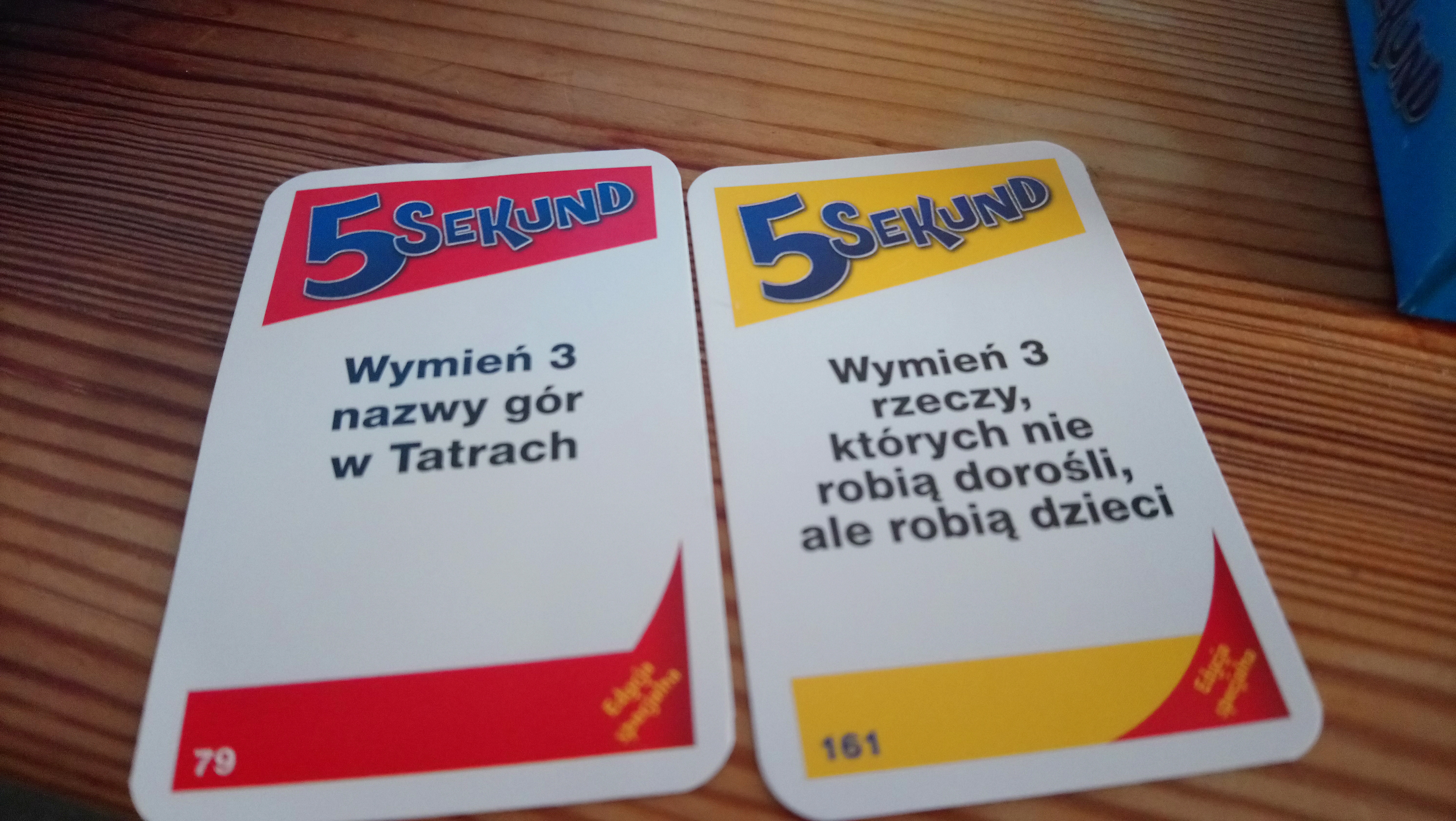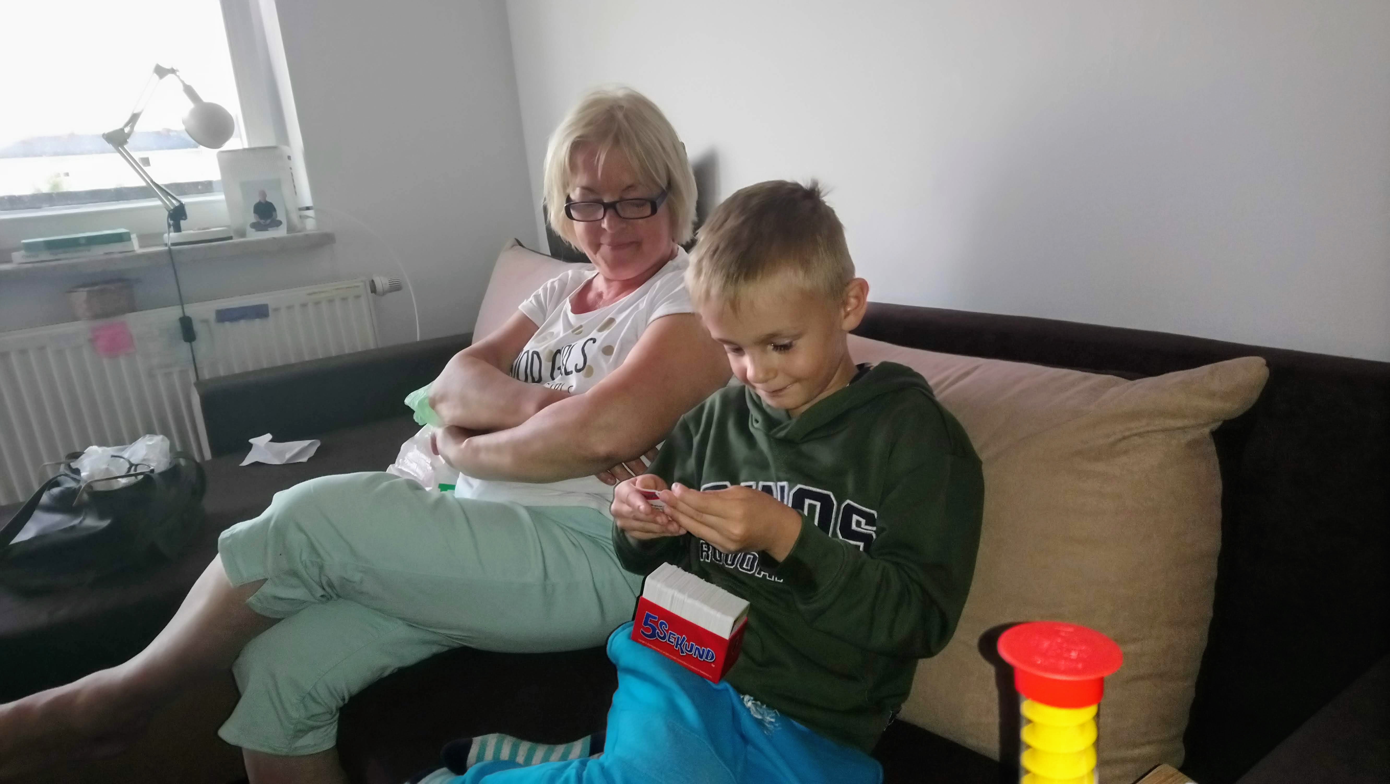 Jak wrócili już z tej plaży, to jeszcze Kacpuś pamiętał, że wchodząc do niej do mieszkania widział grę „5 SEKUND”, bardzo chciał też w nią zagrać, pomimo, że to była gra raczej dla dorosłych. Dzielny i pomysłowy szkrab zmienił jej nazwę na „5 SEKUND DLA RODZINKI” 🤭 [ok, umówmy się, że nie trzymali się tutaj aż tak bardzo tego czasu = 5-ciu sekund. A był to między innymi czas, w którym kulka na tym żółtym „stojaku” (widocznym na środkowej fotce) musi pokonać drogę z góry w dół, a jak już ona zleci na dół, wtedy przekręcony zostaje ten „stojak” ponownie], przykładowe pytania widać na fotce poniżej… , oczywiście Kacpuś nie znał na wszystko odpowiedzi, ale nawet one dwie [dorosłe osoby!] miały z tym niekiedy także problem. 😋