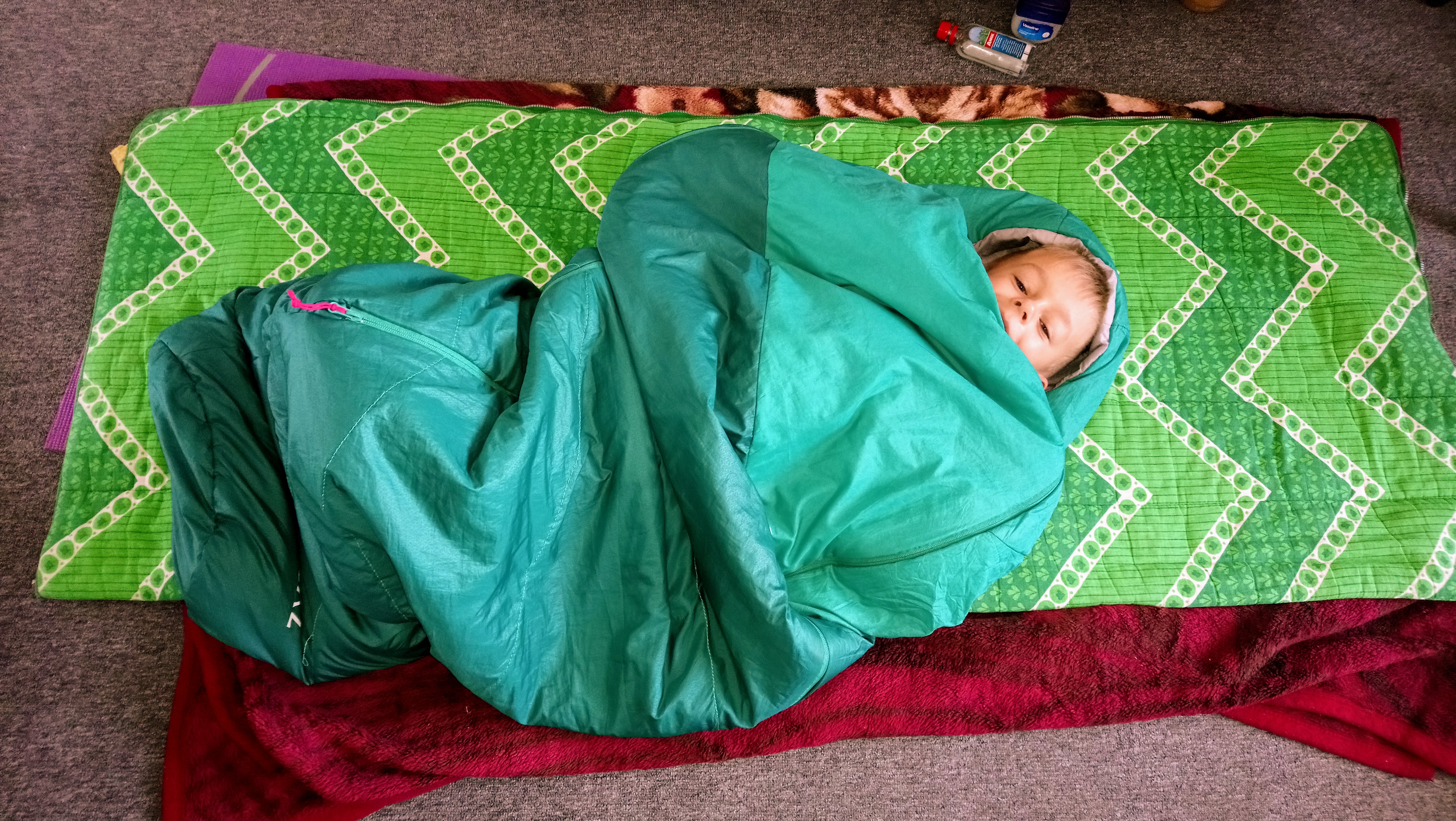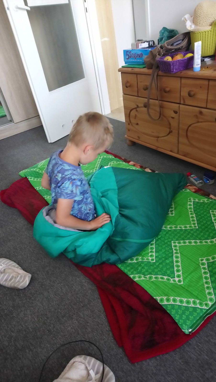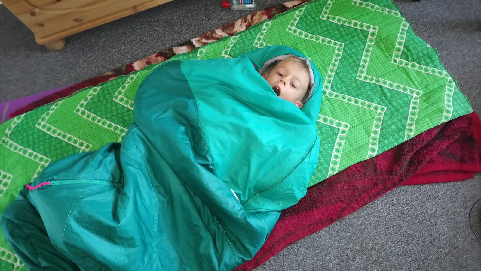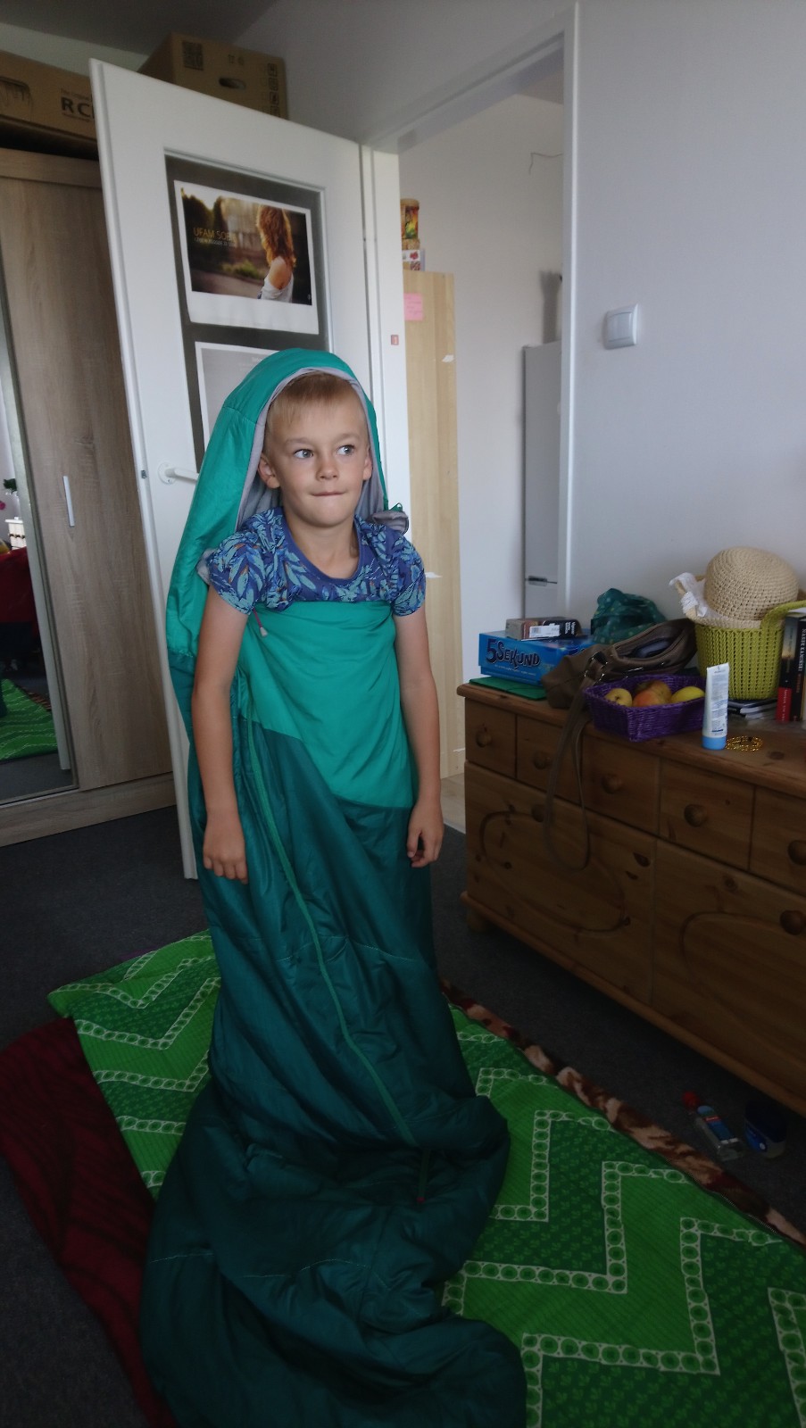 W każdym razie nasza bohaterka spała przez te 2 nocki na podłodze w śpiworze. A Kacpuś, jak to zobaczył, to oczywiście musiał popróbować, jak to jest w tym śpiworze [ogórku, czyli😋] i zaczął się po prostu tam wygłupiać.