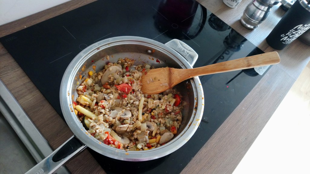 Później jeszcze sobie pomyślała, że ma już przecież te zrobione warzywa na patelnię z pieczarkami i cukinią… Pomysłowa ona, dodała po prostu jedno do drugiego i stwierdziła, że tym sposobem nie będzie musiała już nic więcej kombinować, a wykorzysta to, co właśnie zrobiła! I tak też uczyniła. Czego efekt na poniższych fotkach:
