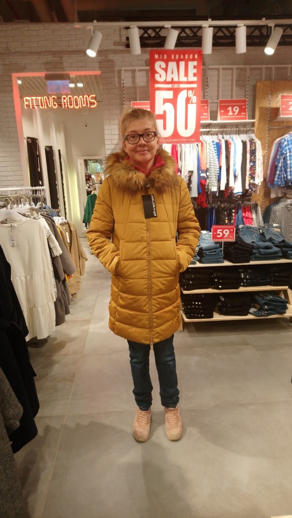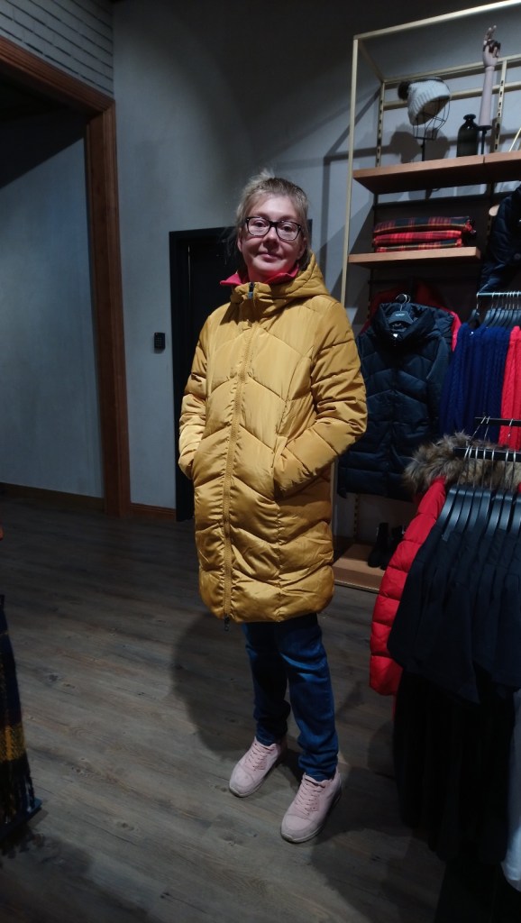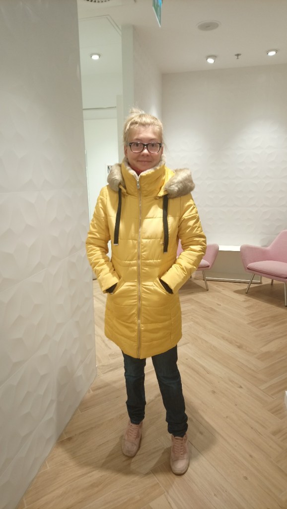 Odpowiadał jej w sumie najbardziej, bo kaptur miał bez futerka i kolor nie był jasny żółty, tylko taki fajny „miodowy”/ „bursztynowy”, wprawdzie chyba najszerszy z tych wszystkich, które przymierzała, bo mieściła się nawet w rozmiar S! Lecz, jeśli chodzi o ten płaszcz, to nie było nawet takiej jego „rozmiarówki” w sklepie. Pomyślała zatem sobie, ok. najwidoczniej tak miało być! Przecież pod taki płaszcz można się wtedy spokojnie jeszcze nawet grubiej ubrać. Zakupiła go i wracała szczęśliwa do domu 😊