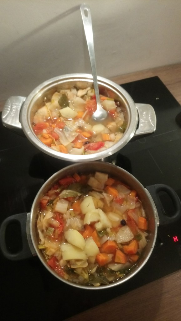 A tak oto wygląda ugotowana przez nią zupka. Przyrządziła ją w 2 garnkach, ponieważ nie posiadała jednego takiej wielkości, jak w tym przepisie [na razie postawiła na podłogę do przestygnięcia, a jutro poprzekłada/ poprzelewa do pojemników i zamrozi!]: