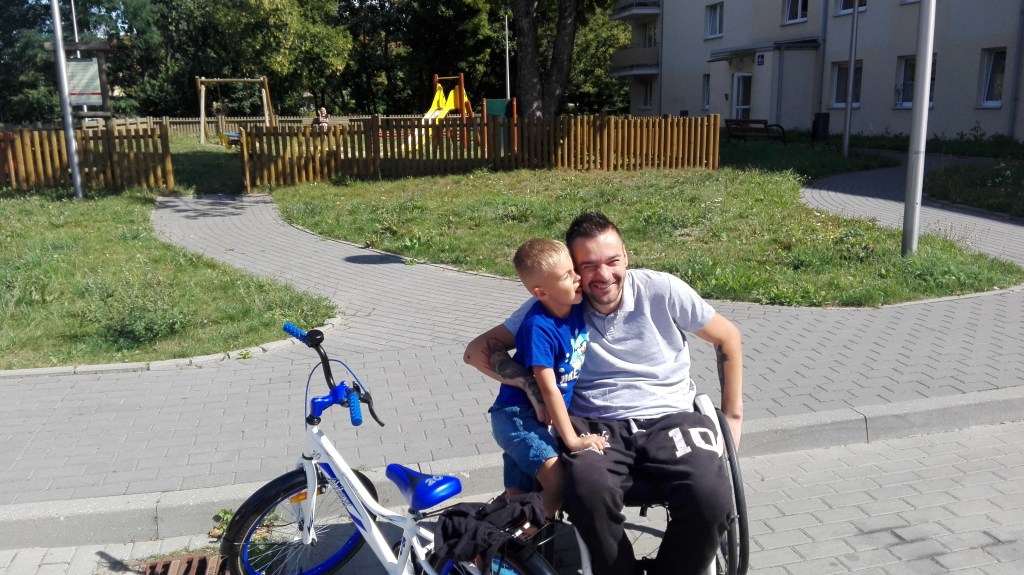 Kacpuś od razu chciał go wypróbować, bo przecież na tamten także siadał, hehe 🤣 Jednak, jak sam jej brat twierdził, wózek na razie stoi, bo Marcin raczej sam woli jeździć swoim starym, bo przez to, że nie jest żaden elektryczny, przynajmniej może trenować mięśnie rąk..