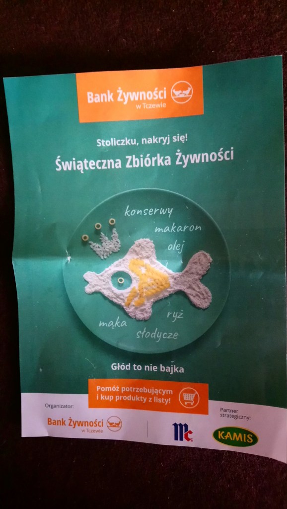 Ale ok., pomyślała więc, jak już tu jest, to zakupi choć w Piotrze & Pawle [skoro aż tam doszła] te naturalne jogurty, których nigdzie indziej nie ma. Ach tak, a tam zobaczyło to dziewczę, że stoją młodzi ludzie z wózkiem i zbierają jakieś produkty od klientów, którzy zechcieliby oddać coś z własnego koszyka. A była to OGÓLNA ŚWIĄTECZNA ZBIÓRKA ŻYWNOŚCI, jak już tam weszła do sklepu to właśnie chłopak z dziewczyną rozdawali takie ulotki: