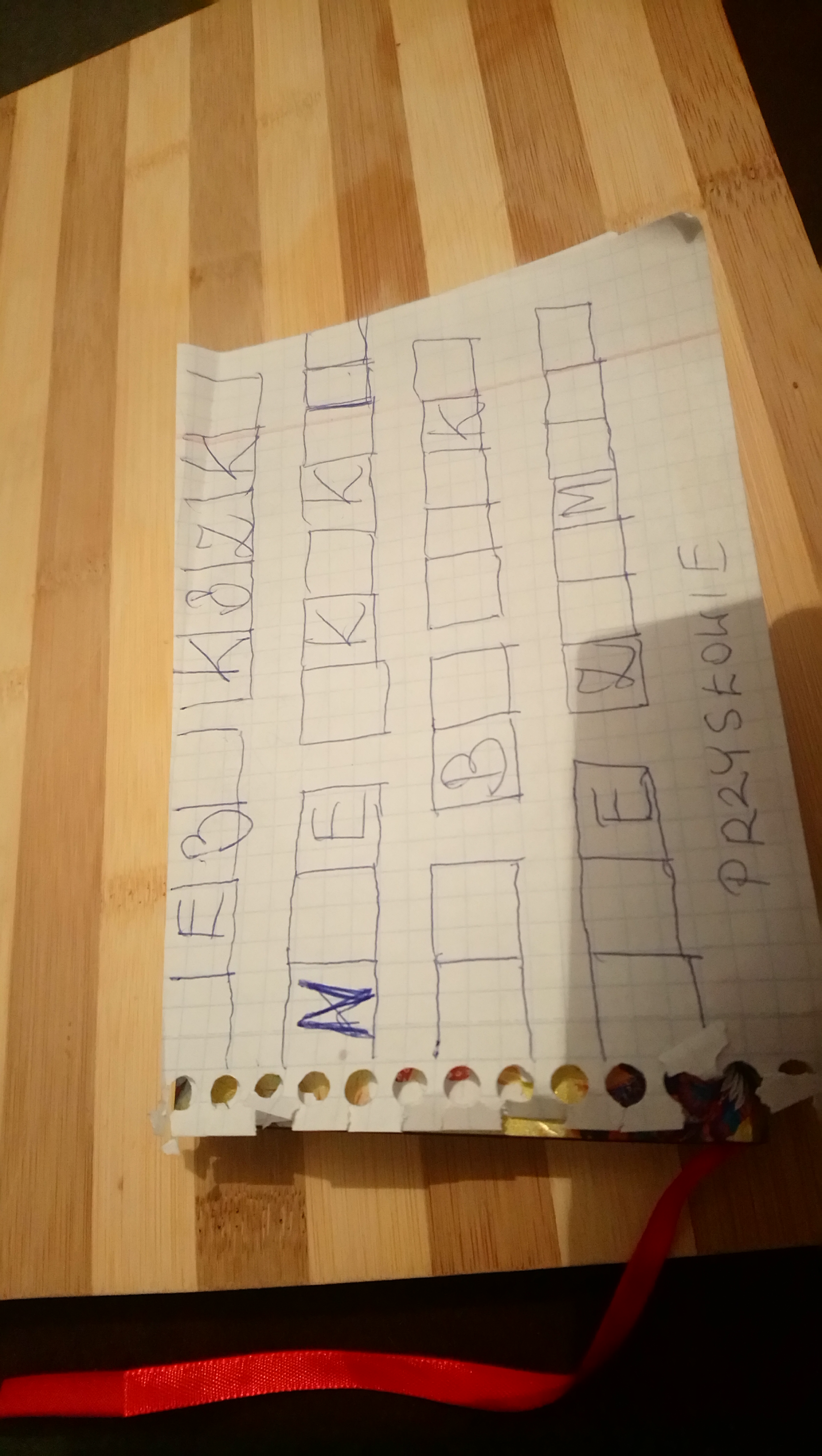 Następnie mama [a później Kacpuś] podaje jeszcze kolejne i ta osoba, która to przysłowie „wymyślała”, wpisuje te litery podane przez współgrającego [bądź nie, jeżeli te powiedziane akurat w nim nie występują]. Mama jej wprawdzie to rozrysowała, jak już dotarły do domu [troszkę się tu pomyliła, bo chyba przysłowie brzmi: GDYBY, nie „żeby” KÓZKA NIE SKAKAŁA…hehe, no nie ważne :P]