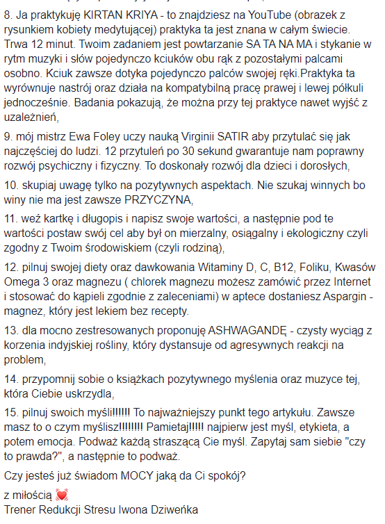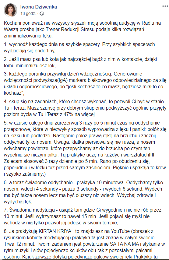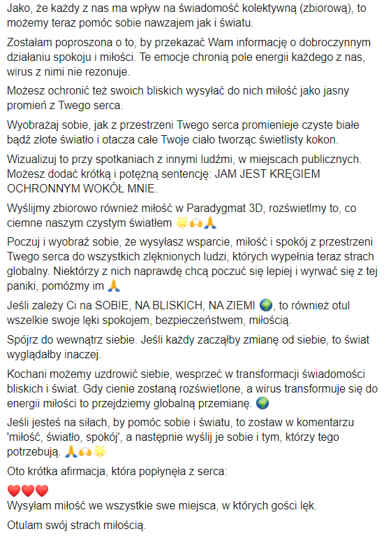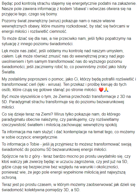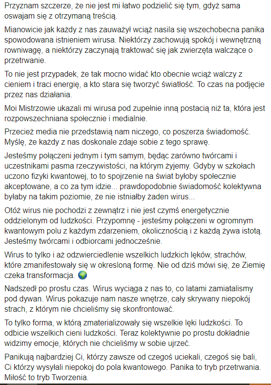 Dziś jednak po tym, jak dosłownie króciutko pomedytowała, bo pytała WSZECHŚWIATA, co ma w tej sytuacji zrobić, a ten jakby „rzekł” do niej, iż powinna zlikwidować te posty z FB i LI. Zatem po medytacji szybciutko cofnęła tą publikację o tym wirusie. Wtedy też zauważyła na Grupie TNŚ MEGA MĄDRY PRZEKAZ & się uspokoiła, poczuła taką wdzięczność 🤗