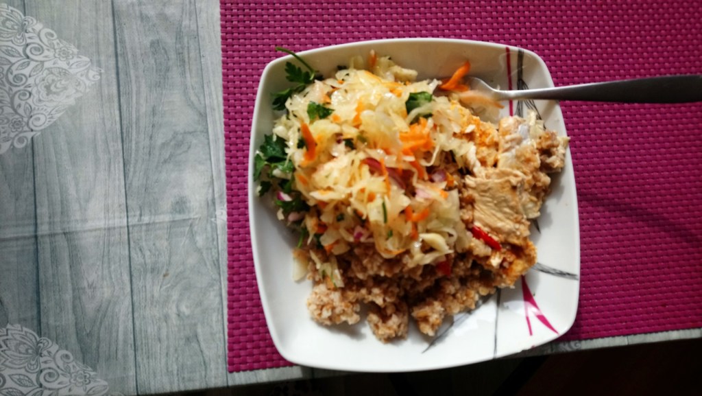 Wróciła do domu, trochę jeszcze ogarnęła mieszkanie i zaczęła przygotowywać obiad, a dzisiaj jego skład to: ryba [pieczony łosoś], kasza i oczywiście surówka z kiszonej kapusty, a wyglądał on następująco: