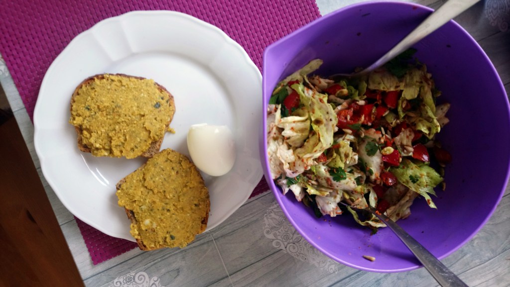 Zaczęła przygotowywać sobie śniadanie: a na dziś zrobiła sobie kanapki z wczoraj zakupionego chlebka fitness i z pastą, którą nasza „gwiazda” sama przygotowała, dokładnie jeszcze 29.02.20 i wtedy również część jej zamroziła, podpisała oczywiście na pudełeczku składniki po niemiecku😉. Zatem jej skład to: