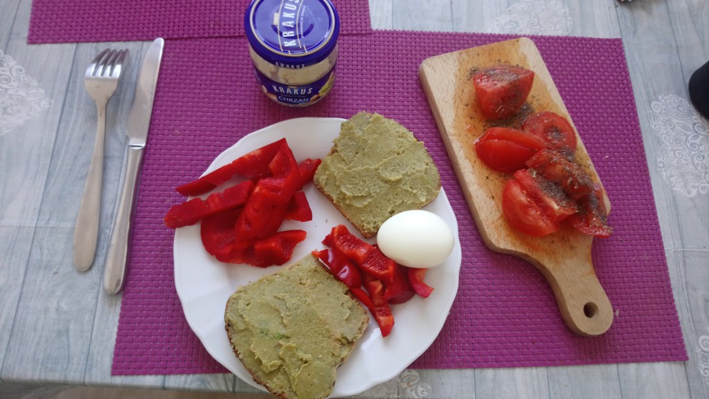 Jest już dawno po obiedzie, dziś to była znowu kasza i surówka z kiszonej kapusty, którą sobie w tym warzywniaku właśnie zakupiła i tym razem rybka, którą przygotowała sobie już wczoraj, a zjadła tylko połowę.