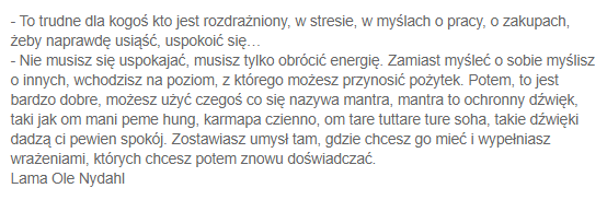 Następnie jeszcze podczas medytacji naszła ją taka myśl odnośnie tych maseczek, które przecież zakupiła, zastanawiała się, kiedy one w ogóle do niej dotrą, ale ponieważ już nawet nie pamiętała dokładnie, kiedy je zamawiała, to pomyślała po prostu, że zapyta o to Ilonę właśnie. I tak ta jej napisała: