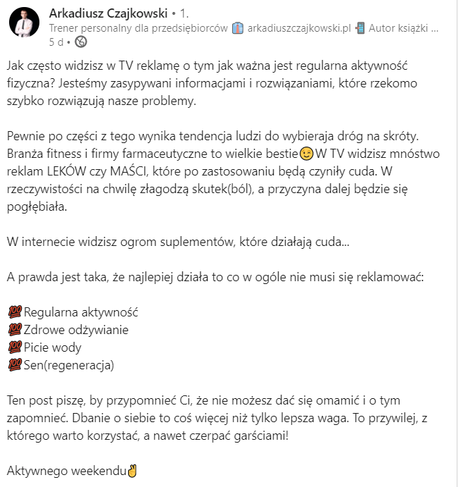 Jeszcze leżąc w łóżku, ponownie weszła na LI, by obczaić, „co tam słychać”, lecz chyba przede wszystkim, jak się „mają jej publikacje”. I dostrzegła, przeczytała i udostępniła tam ponownie publikację tego Arkadiusza, którego kiedyś już coś również poleciła. A mianowicie teraz to było: