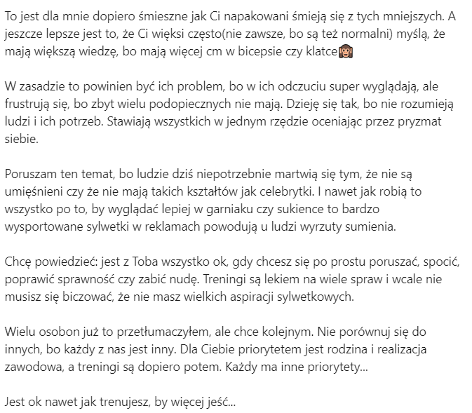 „booooszeee, dlaczego ja jestem taka niemądra i nie daję w ogóle szansy innym mężczyznom, przecież, do cholery, jestem pewna, że jest wielu mądrych? A ja się kurna uczepiłam tego Gracjana, jak jakaś nienormalna, TYLKO dlatego, że subskrybuję jego kanał, a on publikuje tam jakieś swoje nagrania… i… jeszcze kompletnie mnie w nich „olewa”, w dodatku przecież nawet on jakoś specjalnie swoim wyglądem nie zachwyca…”