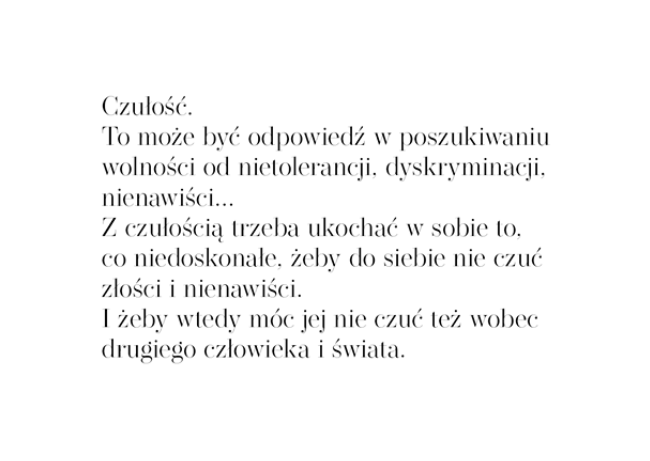 Ale dlaczego tak właśnie myślisz, że GŁUPOTĄ JEST POWIEDZENIE OTWARCIE KIM JESTEŚ I CZEGO POTRZEBUJESZ? Uważam to za szalenie odważny ruch, może tylko desperacko wyglądający dla „przeciętnego” człowieka, którym Ty, przecież doskonale to czujesz! już dawno nie jesteś! Nie wiem nawet, czy kiedykolwiek taka byłaś, jak inni… Dlaczego nie dajesz sobie w ogóle prawa do tego, by się tak czuć, by pobyć właśnie w takim nastroju? Pamiętasz o napisie, który namalowałaś? Jeśli nie, to spójrz proszę tylko jeszcze raz [i spoglądaj na niego tak często, jak tylko potrzebujesz]: