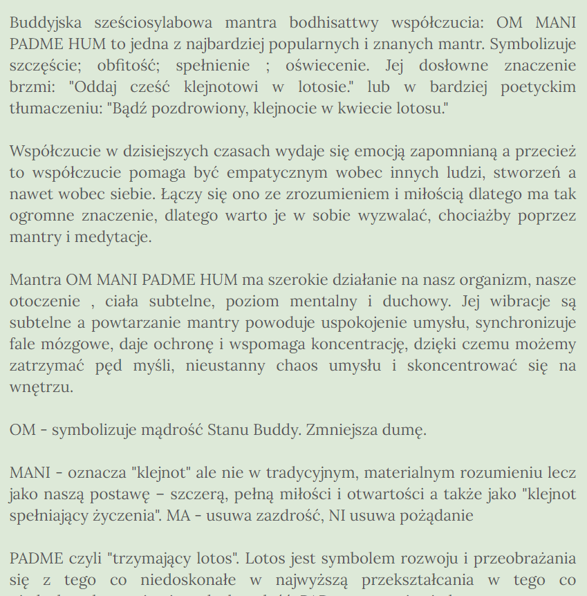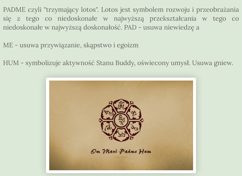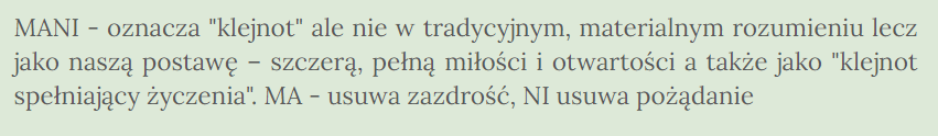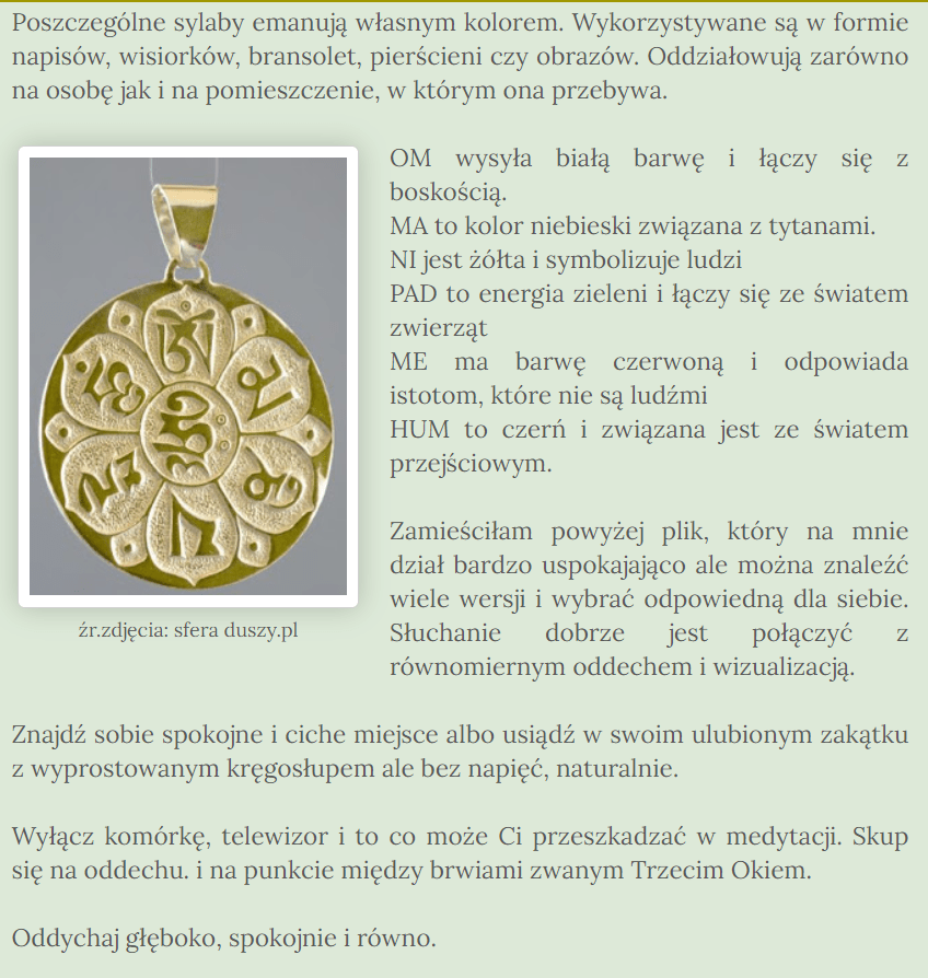I tak, moi drodzy, po medytacji, rozpoczęła swoją gimnastykę, do której słucha mantry OM MANI PADME HUM… Nie wiedząc nawet za bardzo, dlaczego akurat właśnie ją włączyła… Nie chciała już bowiem słuchać w kółko tego samego. Coś jej się wprawdzie kojarzyło, ale jeszcze to sprawdziła i wyczytała, że: