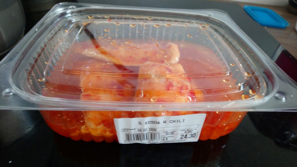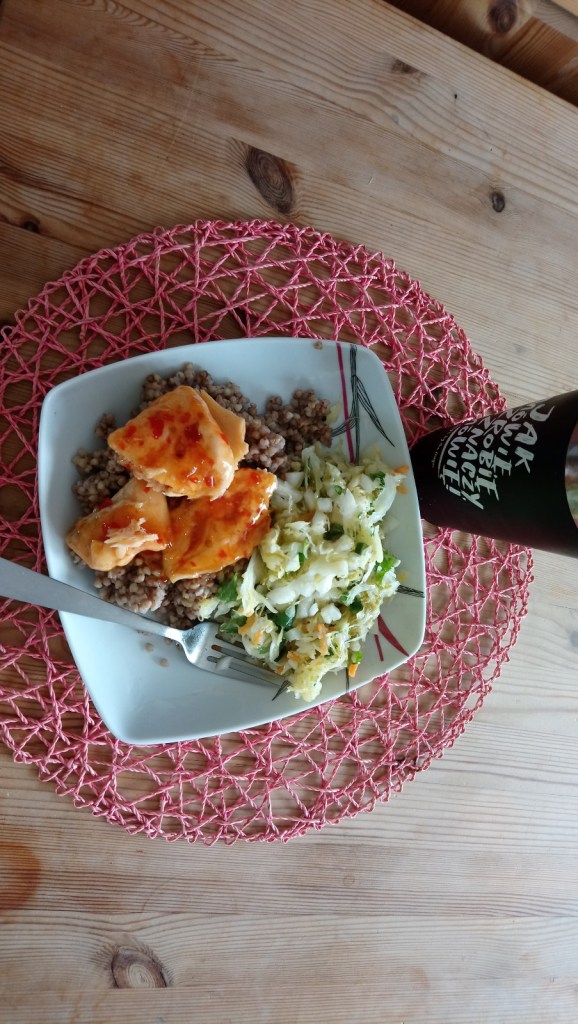 Ale ok, bo znowu się rozwlokła za bardzo, a zaczęła przecież o tym swoim obiedzie:P Także w tej aptece i Rossmannie była jeszcze w sobotę, następnie zaszła do delikatesów rybnych i tym razem zakupiła łososia w Chilli, a ponieważ miała w domu tą kaszę, więc po tym jak przesypała ją do pojemników, zaczęła również gotować ją sobie na obiad. Ach tak, a jak już tam była to zaszła również po drodze do warzywniaka p. Tomasza i zakupiła świeżą kiszoną kapustkę! Z której w domu przyrządziła sobie surówkę: