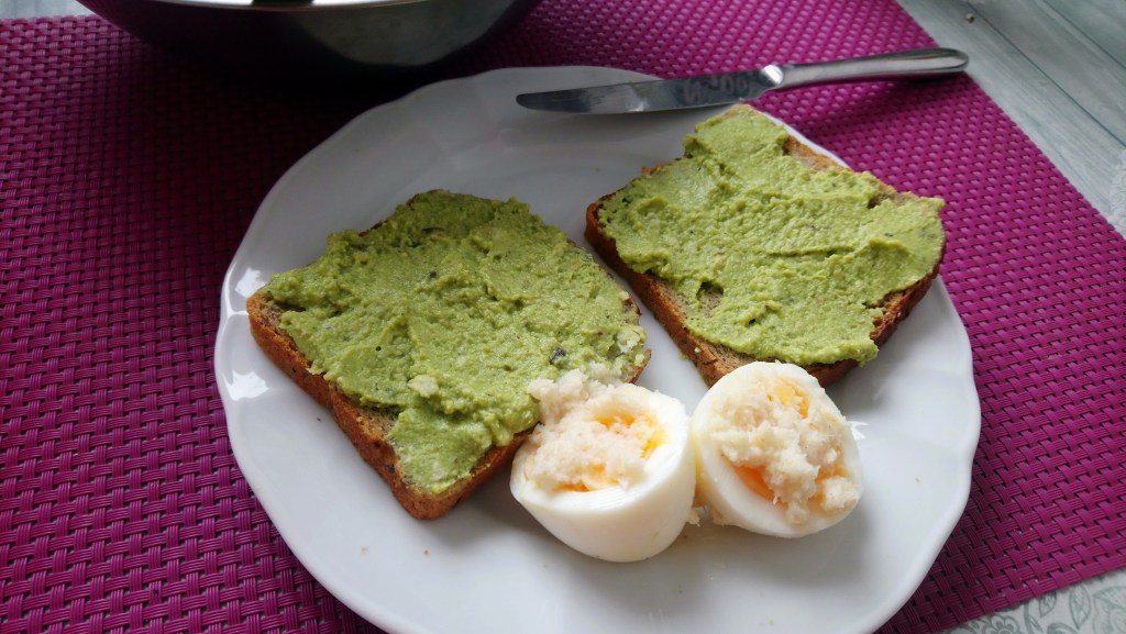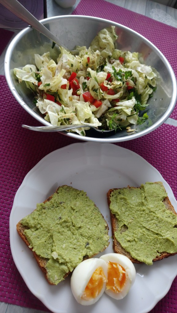 Lecz dziś, ponieważ to miał być taki pozytywny dzień przecież! Zaczęła dobrym śniadaniem! Pomyślała, że skoro odmrażała wczoraj tą lodówkę, zauważyła przy okazji w zamrażalniku tą właśnie pastę na chlebek m.in. z brokuła. Zatem ponieważ tam miała także 2 kromki razowego…, także wyjęła je sobie, ugotowała jeszcze jajo do tego i zrobiła oczywiście sałatę i właśnie takie śniadanko sobie dziś zjadła! [tzn. oczywiście nie wszystko na raz😋]