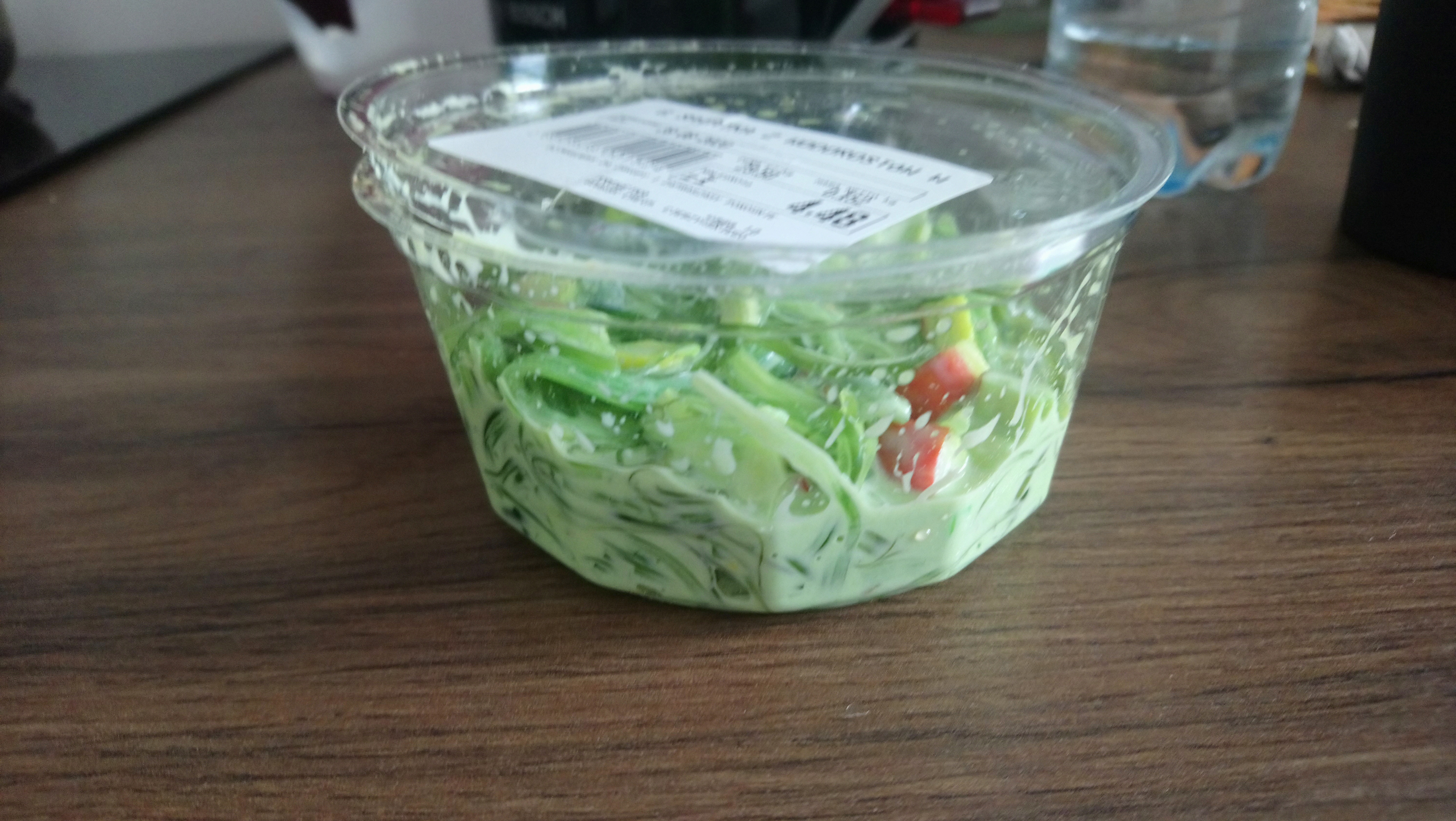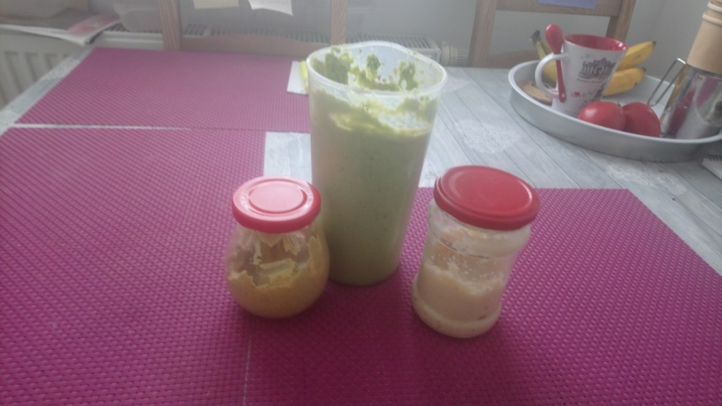 Na całe szczęście zamiast makaronu wzięła sobie do tego troszkę kuskusu, który sobie przyrządziła [zalała gorącą wodą/ wrzątkiem i odstawiła na te 10 minut]. Tzn. oczywiście, Bogu dzięki, nie zjadła tego wszystkiego, co zrobiła! Wzięła sobie tylko małą porcję, a całą resztę przełożyła jeszcze do pojemniczków, podpisała co tam jest i dodała dzisiejszą datę!