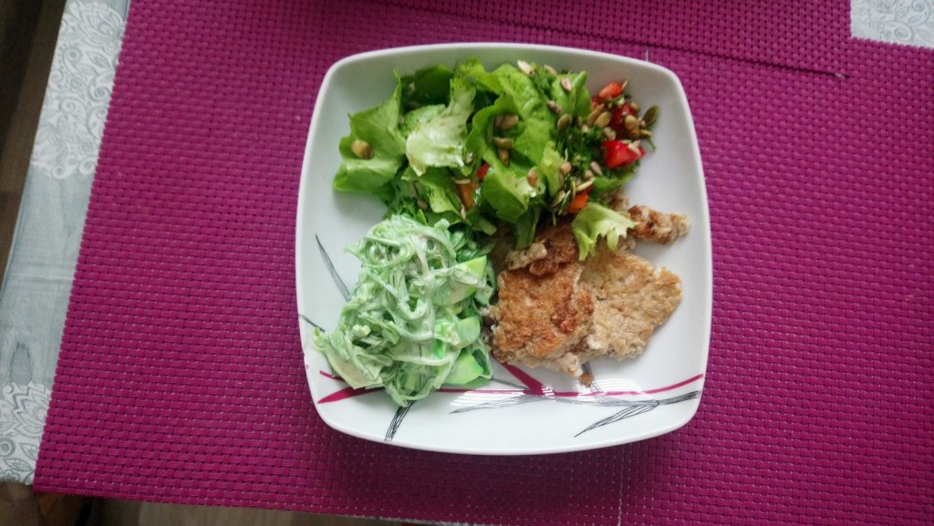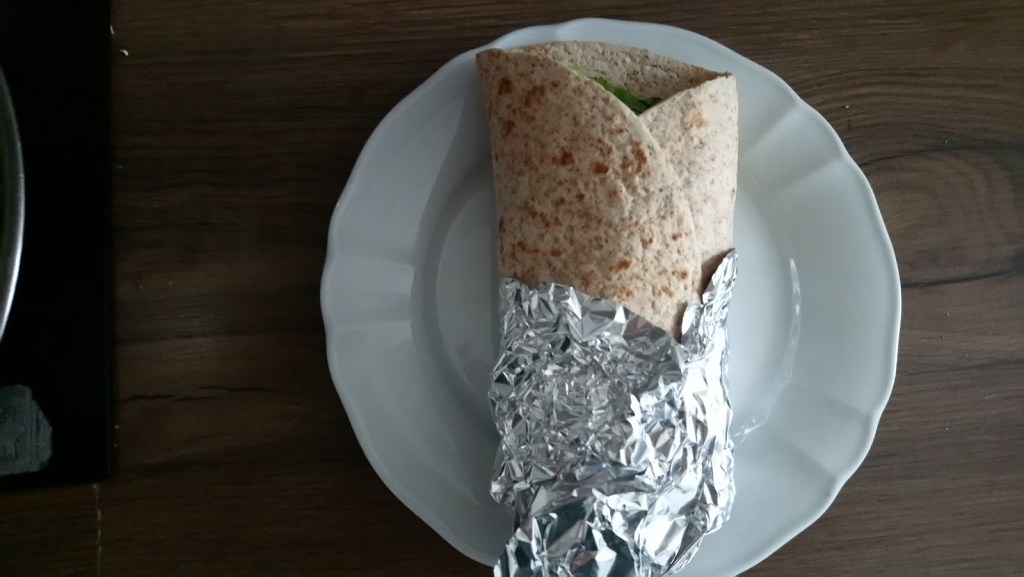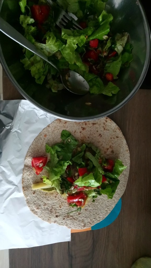 W tym wpisie doniesie tylko Wam, że dziś na śniadanie wykonała już dla siebie tą pastę z brokuła! A dodała do niej również [tak, jak w tym przepisie] 2 jaja, pestki słonecznika [te jednak tak wsypała po prostu ze swojej puszki, więc z pewnością było ich więcej niż te 2 łyżki:P], zamiast jogurtu, dodała jednak i chrzan i musztardę, a zrobiła sobie z tą pastą na dzisiaj właśnie Wrapa, do którego dodała oczywiście zrobioną również sałatkę, to wszystko uwieczniła na poniższych zdjęciach: