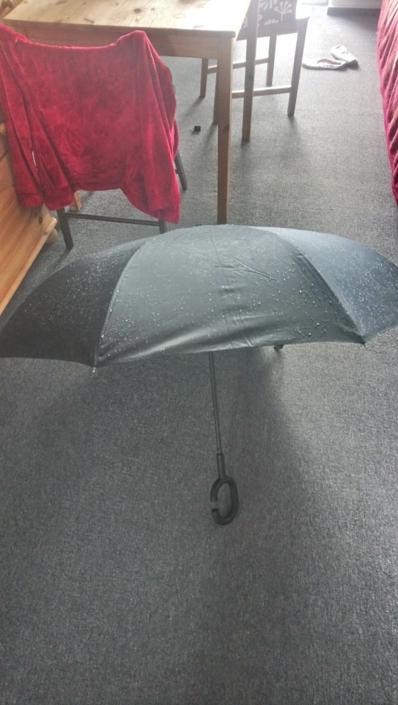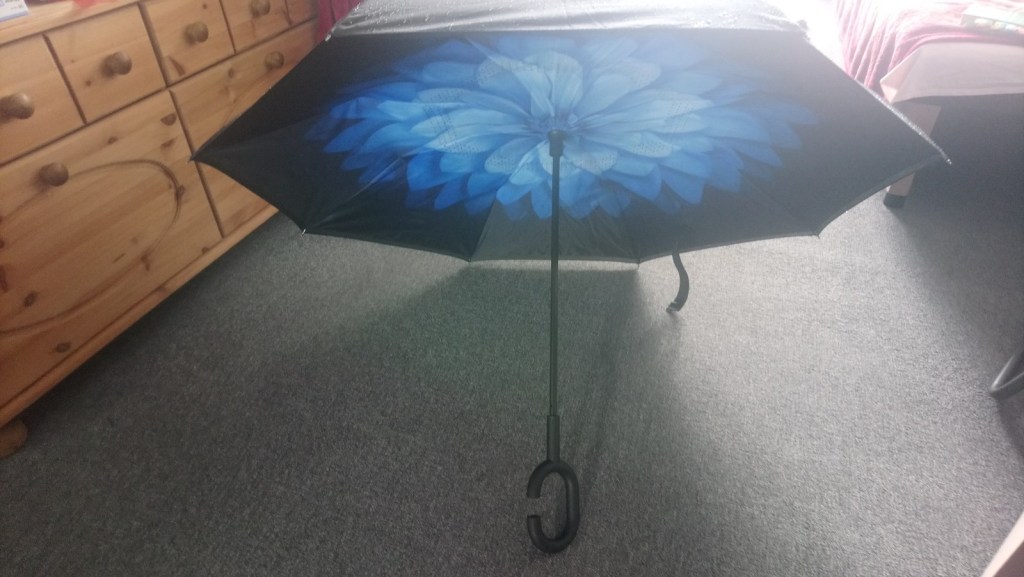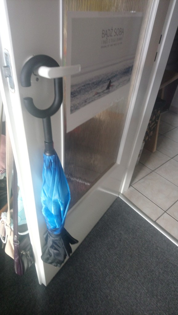 Co widać na powyższych zdjęciach, jest ona taka „dwustronna” i słuchajcie Mała Mi w sumie nawet, jak później dostrzegła, że na zewnątrz jest niestety ona jedynie czarna! Ten piękny błękit widać przecież TYLKO, jak parasolka jest albo CAŁKIEM ZŁOŻONA, albo z kolei znowu tak od jej „środka”… Nasza „gwiazda” jednak po raz kolejny zaczęła o tym sobie myśleć: „A czy to jest takie znowu ważne, co widzą inni? Przecież najważniejsze powinno być dla mnie, co się znajduje nad moją głową i jaki ja mam widok!”
