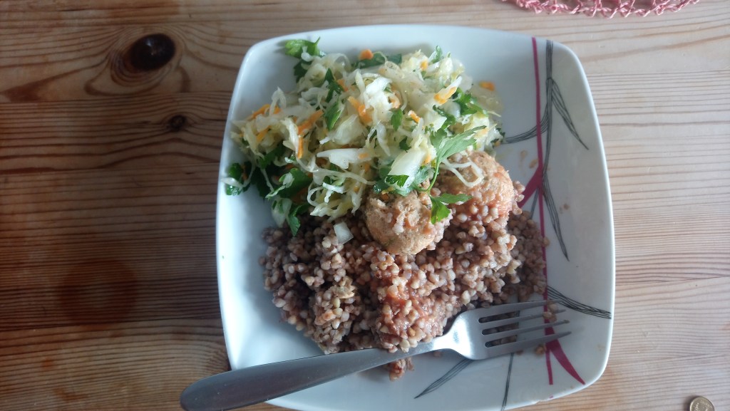 Dzisiaj już przyrządziła dla siebie w końcu porządny ten obiad, bo nareszcie rybę z kaszą i tą surówką z tej młodej kiszonej kapusty: