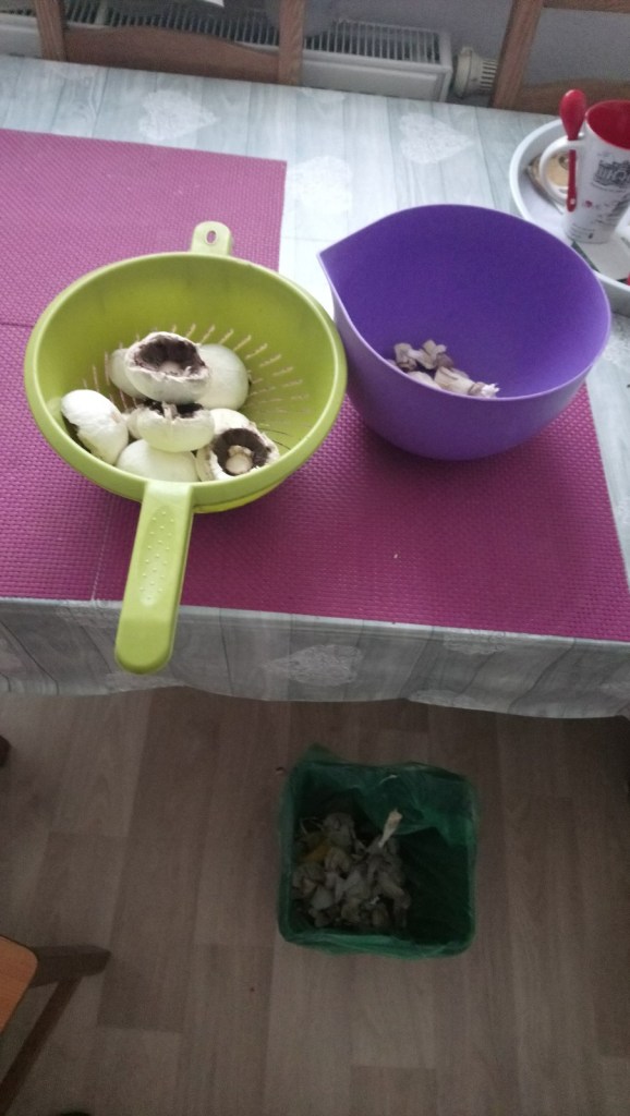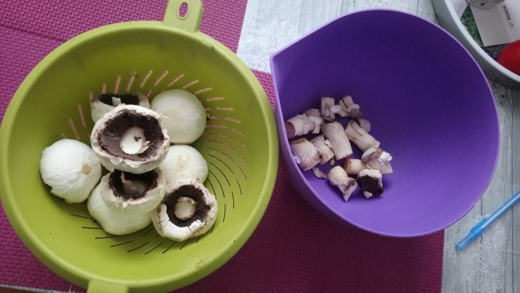 Ponieważ wiedziała, że jeszcze w poniedziałek zakupiła fasolkę [tą już wczoraj ugotowała], ale również zostały jej jeszcze te pieczarki! I dlatego postanowiła zrobić z nich jakiś użytek! Kupiła je tak po prostu, chyba z myślą, że już dawno nie jadła „młodych pieczarek”, dlatego widząc je u p. Piotra w warzywniaku, po prostu o nie właśnie poprosiła. I rzekła w swojej głowie: później o tym pomyślę, z pewnością „coś” z tego na obiad sobie przygotuję! [tak, tylko sobie pomyślała wówczas + jeszcze to, że ewentualnie jak zobaczy jakieś odpowiednie (czyli „łatwe” dla niej oczywiście :P) przepisy w necie, to ewentualnie coś jeszcze dokupi😜].