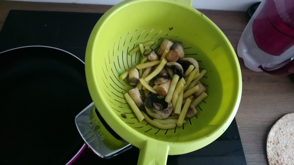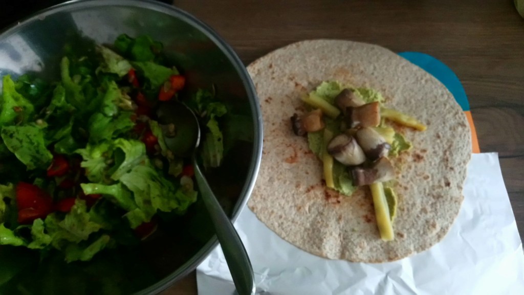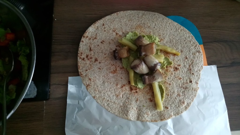 Na zdjęciach powyżej jest dokładnie wszystko! Od jej stanowiska, gdy obierała te pieczarki/ je obrane/ ugotowane, nawet tą fasolkę wrzuciła jeszcze do tej wody z pieczarkami, aby się również „ogrzała”, wreszcie rozłożone te składniki, aha a ta „pasta”, którą tam widać [od 4 fotki] to jest właśnie ta z brokuła, którą sobie wcześniej już przygotowała 😊. Dalej położyła na te pieczarki i fasolkę jeszcze sałatkę, którą również zrobiła. W ogóle to, kochani, ona spojrzała jeszcze raz na te swoje porcje, które zawsze robiła [jak dobrze, że dokumentuje to jednak zdjęciami! hehe 😋]. I stwierdziła, że te jej „porcje” są chyba jednak zbyt duże…, przecież powinno się jeść może nie: „często”, ale zdecydowanie „regularnie”! owszem i tylko raczej „w niewielkich ilościach”! Zatem, kochani, dziś postanowiła, że spokojnie się naje tym jednym Wrapem, nawet nie aż tak pełnym w środku.