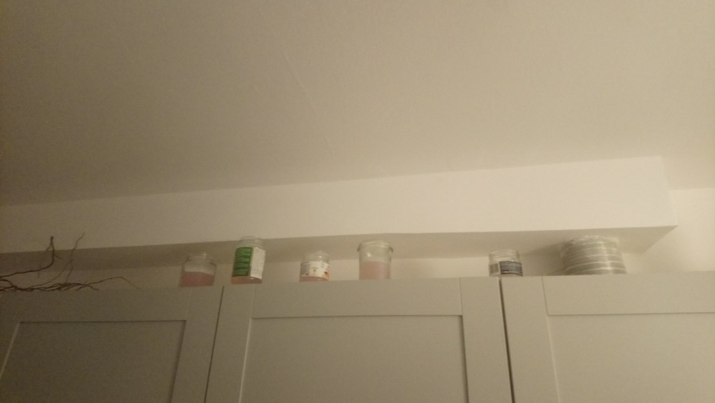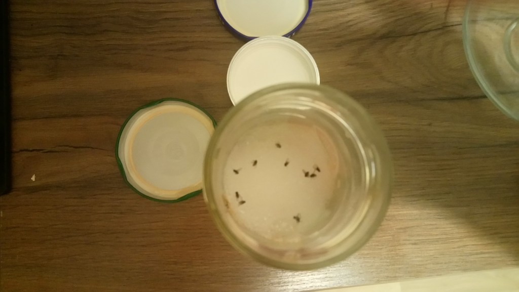 No w każdym razie poczyniłam tyle tych pułapek, co widać na poniższych zdjęciach… I tak przyglądam się, a te muszyska jak siedziały na tym suficie, tak siedzą i jakoś ten zapach octu ich wcale nie zwabia… Myślę sobie, o nie! Tak się z wami bawić nie będę… I wyobraź sobie, że wzięłam, tak po prostu, jakby to powiedzieć: na próbę? podetknęłam pod taką jedną muchę siedzącą na tym suficie taki słoiczek z tą miksturą, ale tak centralnie pod nią, by nie mogła odlecieć…
