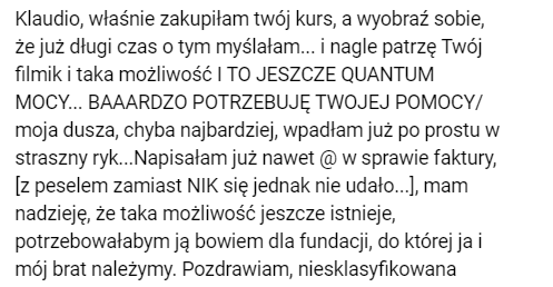 Hej kochana, co u Was i jak żyjecie? Przepraszam, że dopiero teraz to piszę… Ale 13.10. pozwoliłam sobie zacytować Twoje wiadomości na moim blogu… Podaję adres tego wpisu: https://niesklasyfikowana.com/2020/10/13/widziec-sens-we-wszystkim-co-ci-sie-przydarza/ Jeśli oczywiście miałabyś coś przeciwko, daj mi tylko znać. To pozmieniam tam choć Wasze imiona. Jeszcze raz NAJMOCNIEJ PRZEPRASZAM, ŻE ZROBIŁAM TO, NIE PYTAJĄC CIEBIE NAWET O ZGODĘ. Bardzo na to liczę, że mi wybaczysz ️[18:34]