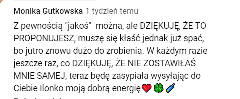 Otóż to. I tak sobie pomyślałam: ok. ale to przecież o niczym jeszcze nie świadczy… I dokładnie wczoraj jeszcze Mariola zabiła mnie niemal tym swoim tekstem o Gracjanie właśnie… I to zauważ, że tam obok słowa Gracjan stoi Monika, hehe 😋🤣🤷♀️ Ahhh…, już sama nie wiem, co mam o tym myśleć… Póki co, zostawiam to i tyle. Niech się dzieje, co ma być WSZECHŚWIECIE! Przecież wiesz, mam nadzieję, że JA TOBIE UFAM I WIERZĘ W TO, ŻE POPROWADZISZ MNIE NAJLEPIEJ, JAK TO TYLKO MOŻE BYĆ.