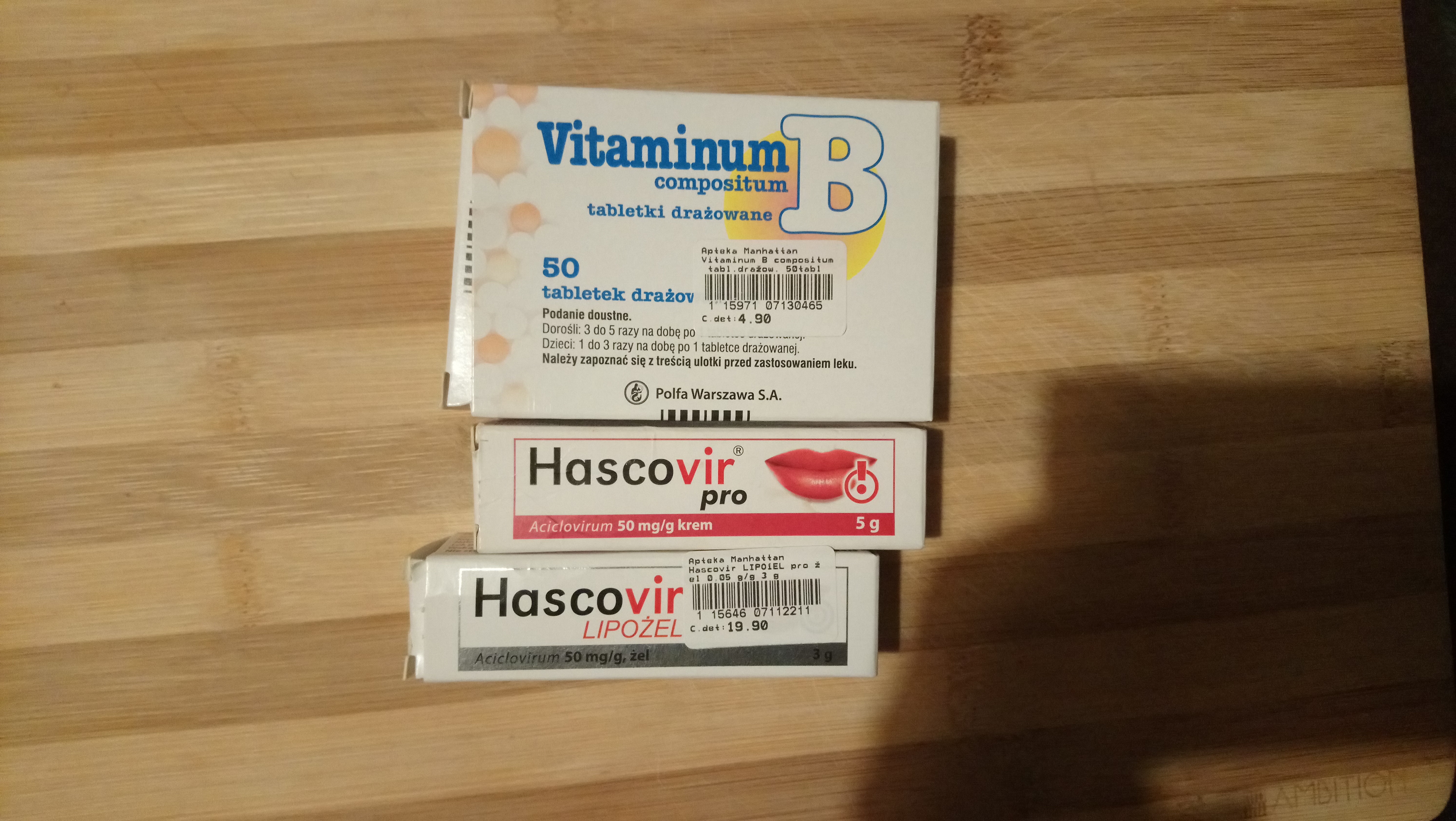 Tzn. tylko jeszcze wyjaśni, bo z pewnością zastanawiacie się, dlaczego zakupiła właśnie 2 maści HASCOVIR… Otóż jedną już miała w domu i tą właśnie posmarowała sobie ten wykwint. Kupując jednak tą wit. B complex, zapytała także, czy jest może jeszcze jakaś maść na opryszczkę i właśnie wtedy polecono jej ponownie HASCOVIR, ale tym razem żel…