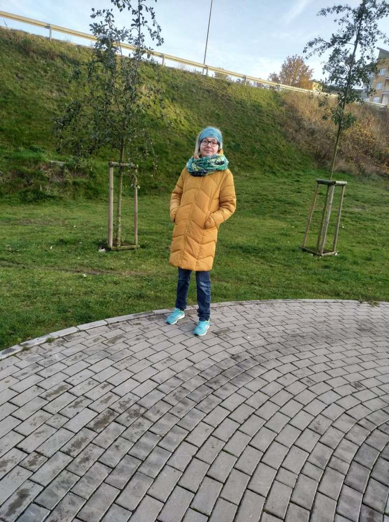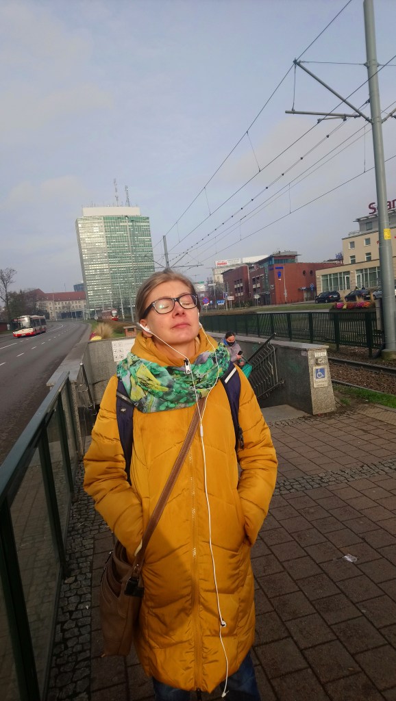 A tu, moi drodzy, jej fotka na przystanku tramwajowym, jak czekała jeszcze na swoją mamę. Nie chciała stać tam w podziemiach, gdzie miały się spotkać, jak ostatnio, tylko wyszła sobie, póki co, jeszcze skorzystać z kąpieli słonecznej 🌞. Stała tam tak i po prostu czerpała z/ od niego energię, a przy okazji poprosiła stojącego obok mężczyznę o zrobienie jej zdjęcia 🍀.