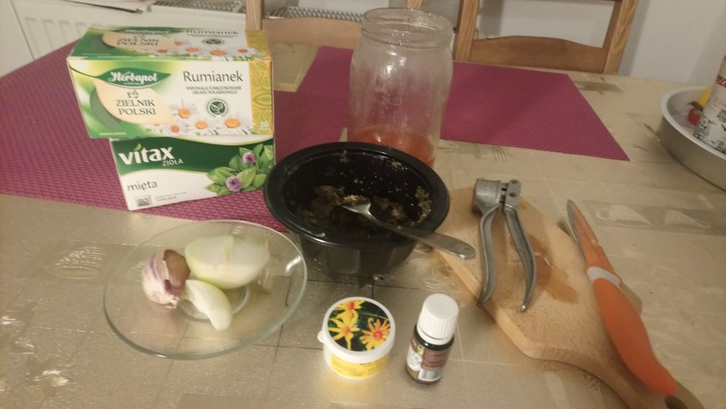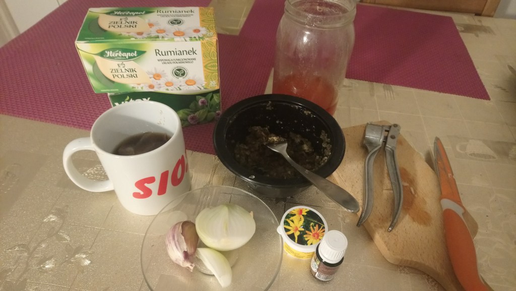 I tak sobie w ogóle o tym wszystkim jeszcze raz zaczęłam myśleć… A już od wczoraj zaparzam sobie właściwie rumianek w dwóch osobnych kubeczkach, w jednym te dwie torebki/ herbatki na całe powieki, osobno zaś [w tym drugim kubku] tą na tą brew… Stwierdziłam w ogóle, że spójrz, tak naprawdę mogłam tego wirusa roznosić nawet tym małym ręcznikiem, którym wycieram sobie praktycznie i ręce i buzię… Następnie pomyślałam także, że przecież nawet na tą buteleczkę od tego olejku herbacianego mogłam również przenieść tego wirusa/ czyli ją zainfekować…