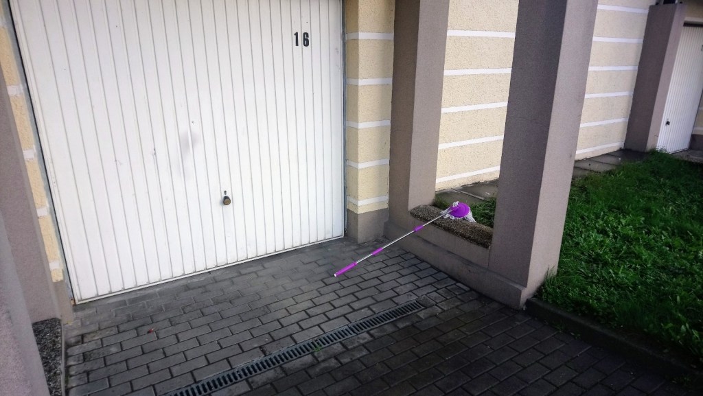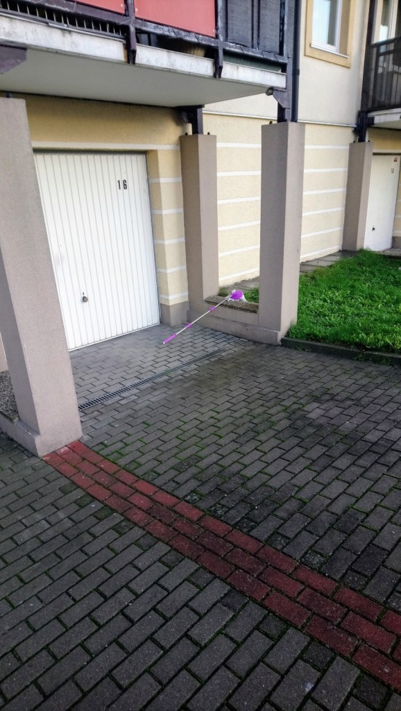 Ponieważ jednak zobaczyła, że tam jest mokro, a była w kapciach… Więc stwierdziła, że nie będzie aż szła do tego prawego rogu, gdzie zawsze zostawiała go, by sobie stał i sechł… Tym razem postanowiła, że umieści go po lewej stronie balkonu. Jak otworzyła bowiem drzwi balkonowe to już ten lewy róg było właśnie widać, stała przy nim niemal :P.