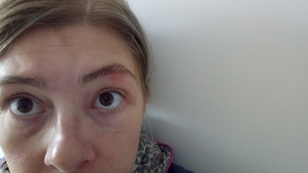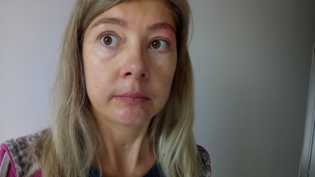 Tą fotkę [poniżej] zrobiłam sobie dzisiaj właśnie… najpierw leżałam ponownie wykonując tą medytację tych 7 czakr, z rumiankiem na powiekach i tym łuku brwiowym… Później zaś jeszcze użyłam tej maści arnikowej.