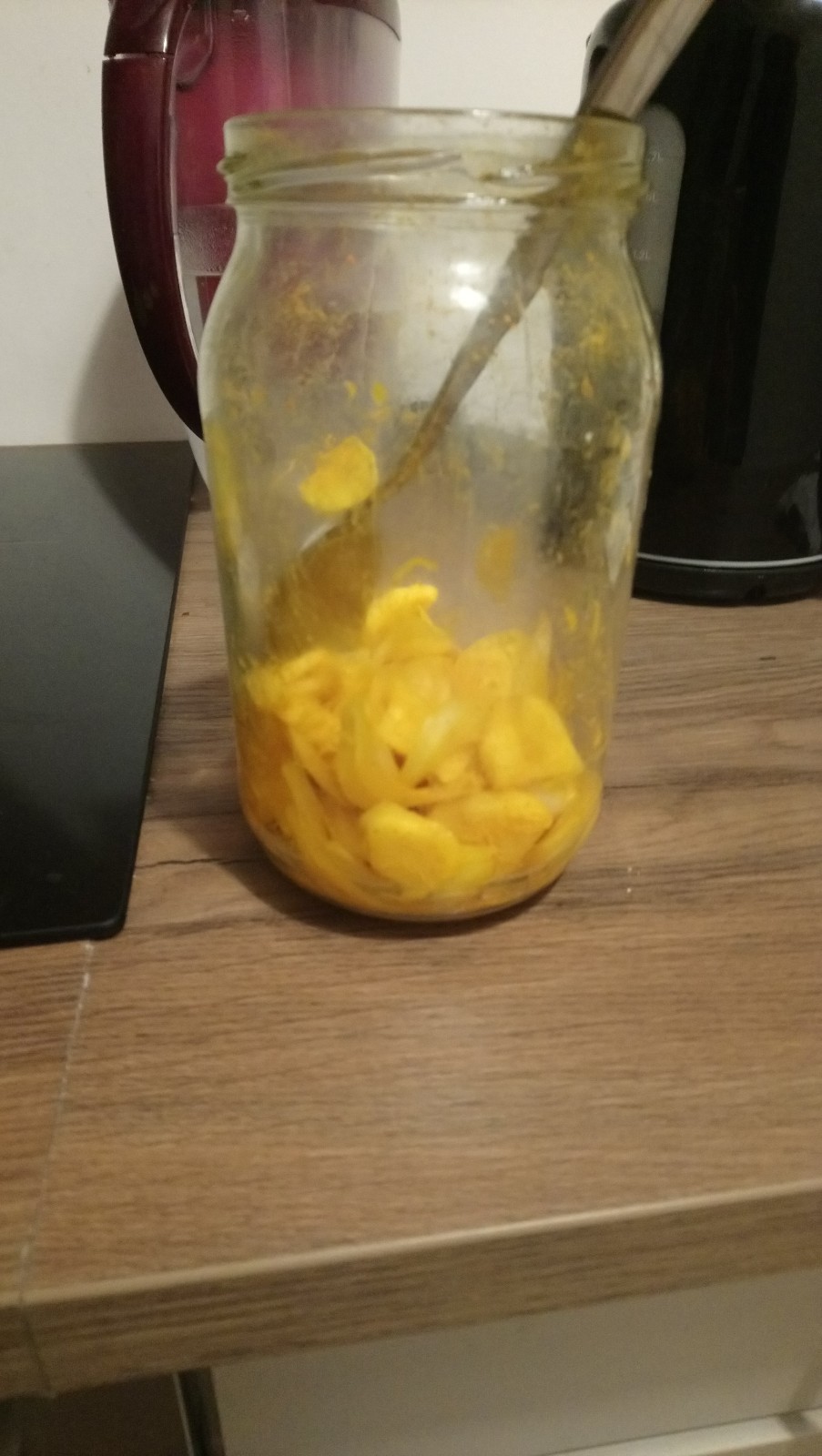 A to jest syrop, który ponownie wykonały razem! To już jest jej 3-ci, bo po tym, jak zrobiła ponownie sama, już go dawno wypiła… Moi drodzy, Mała Mi zaczęła nawet wyjadać z niego te składniki, które tam były, bo pomyślała sobie, że przecież to, jak naturalny antybiotyk! Bo i czosnek, imbir, cebula, cytryna, kurkuma no i miód! hehe I w ten właśnie sposób, zaczęła to po prostu również pałaszować 😜. Oczywiście nie wszystko na raz, ale tak stopniowo!