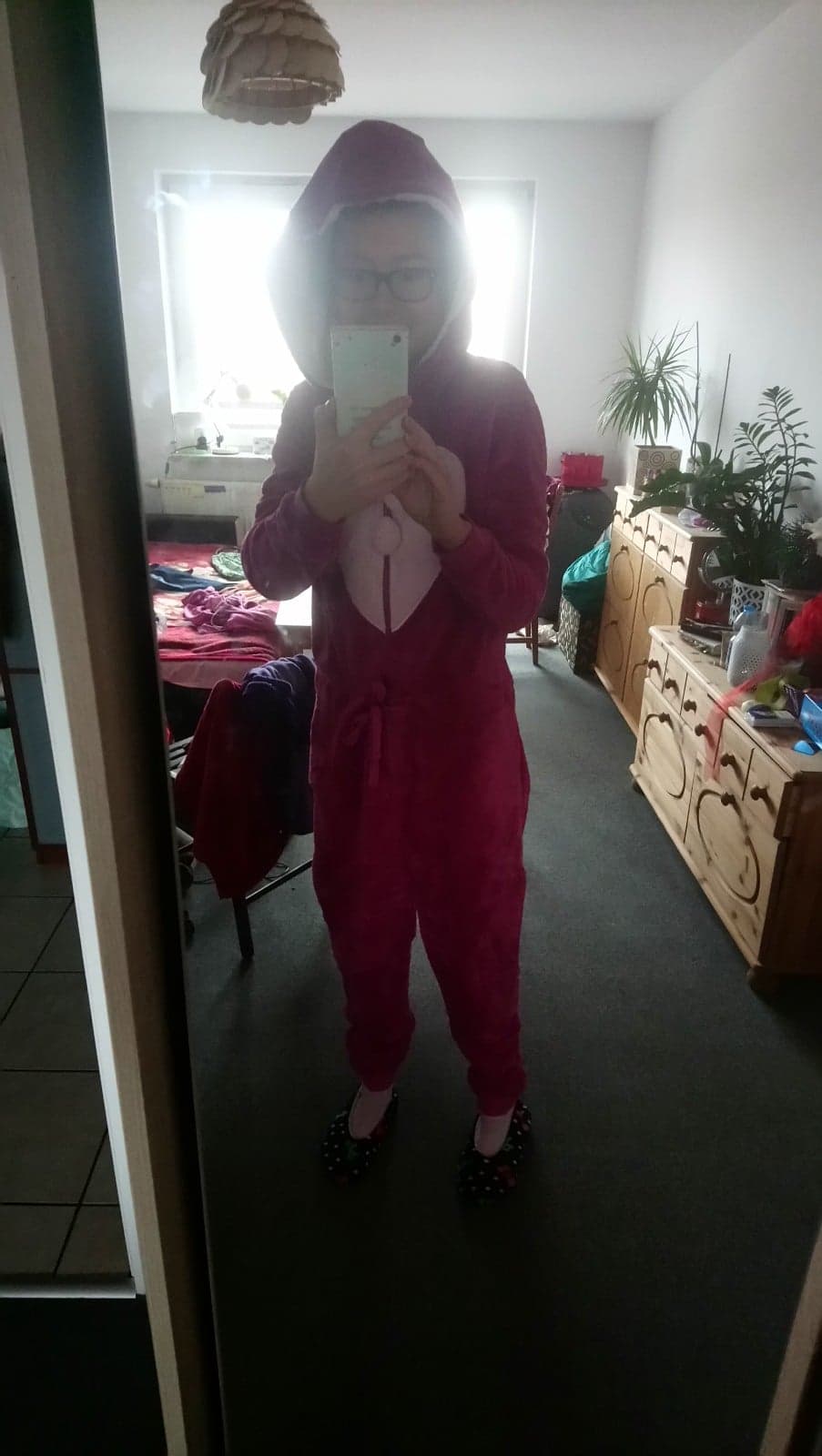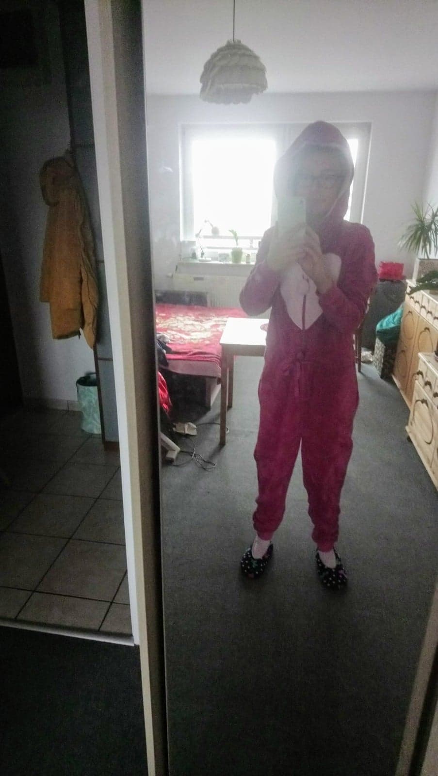 A tak w ogóle to zaraz spojrzałam jeszcze na tą bluzkę [damską różową], którą przecież także zakupiłam! I właśnie wtedy zdjęłam tą siwą górę od tej piżamy, a nałożyłam właśnie tą jaśniejszą [ostatnia fotka], gdzie nawet stwierdziłam, że pasuje mi do tych skarpetek, które miałam właśnie na sobie, hehe 😋