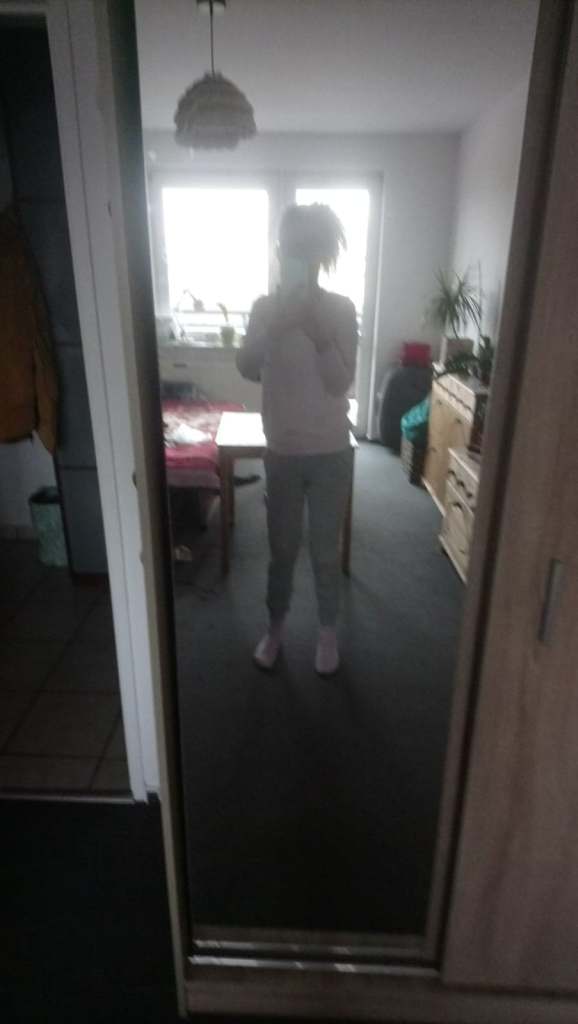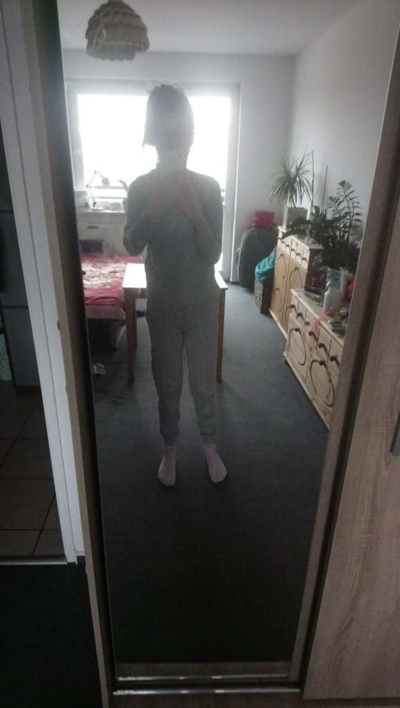 Zatem po przymierzeniu tego kombinezonu, już wiedziałam, że go jednak zostawię! A to, że miejscami był luźny i większy, pomyślałam, że doda mi tylko więcej wygody podczas tego snu, prawda? Więc to był właśnie dla mnie sygnał/ argument, by go jednak pozostawić! Ale skoro przecież nakupowałam jeszcze tyle innych rzeczy, stwierdziłam, iż je również od razu sprawdzę! I tak właśnie kolejną rzeczą, jaką przymierzyłam była ta siwa piżama w rozmiarze XS, którą widzicie na tym 4-tym zdjęciu. W tym momencie jednak już sobie znowu to przetłumaczyłam…