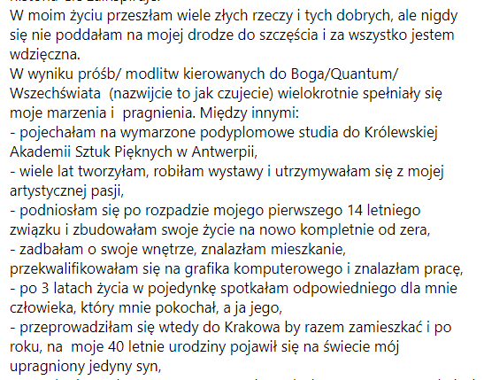 podniosłam się po rozpadzie mojego pierwszego 14 letniego związku i zbudowałam swoje życie na nowo kompletnie od zera, – zadbałam o swoje wnętrze, znalazłam mieszkanie (…) po 3 latach życia w pojedynkę spotkałam odpowiedniego dla mnie człowieka, który mnie pokochał, a ja jego,(…) przeprowadziłam się wtedy do Krakowa by razem zamieszkać i po roku, na moje 40 letnie urodziny pojawił się na świecie mój upragniony jedyny syn,(…) Moją intencją jest by znowu żyć z mojej pasji i z pasji mojego partnera i by stworzyć wspólną firmę.(…)