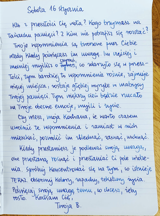 Lecz, moja droga, teraz jestem tego po prostu w 100% pewna, że ten Twój stan jest spowodowany właśnie tą nieprzespaną nocką… W takim razie, najlepsze, co możemy teraz jeszcze zrobić, to myślę, po prostu o tym wszystkim opowiedzieć jeszcze jak to było… Liczę na to, że tyle siły uda Ci się w sobie odnaleźć. Tym bardziej, że na jutro masz już ponownie coś zaplanowane…, ale do tego jeszcze przejdziemy i nam o tym opowiesz dokładniej, ok? To kochana moja, zacznijmy może najpierw od tego, co już wczoraj tutaj sobie notowałyśmy, opowiedzmy to tak, aby wszyscy mogli tu zrozumieć, zatem teraz retrospekcja: