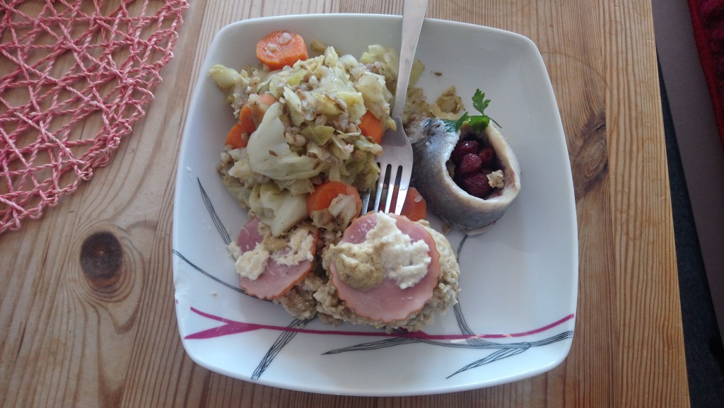 Znacznie bardziej wolałam coś takiego hmmm… jednak z warzywami? Aczkolwiek, żeby było zabawniej, to miałam już resztkę tylko sałaty i nawet żadnego pomidora, papryki… I wtedy moja artystyczna jednak głowa wykombinowała sobie, że usmażę sobie w z takim razie jajo wraz z tymi płatkami owsianymi, na to właśnie już zrobione położyłam jeszcze plastry wędliny, na nie zaś troszkę i chrzanu i musztardy… dalej zaś widoczna jest również ta kapusta na ciepło z marchewką i jeszcze wzięłam sobie również ostatniego rolmopsa z żurawiną, hehe, bo co miał niby sam pozostać w lodówce? 😜