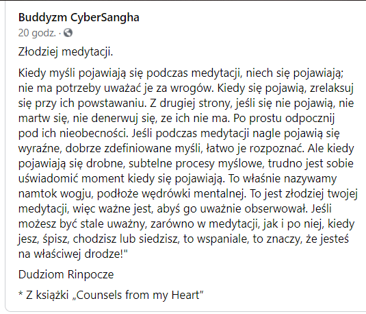 Żadnych zdjęć tych moich pokaleczonych i jakże wspaniale wyglądających nóg jej oczywiście nie wysłałam…Zaczęłam natomiast wtedy mówić, że jak już myślałam, iż nie uda mi się zasnąć, to zaczęłam medytować i przekonywać siebie, że mnie wcale nie boli… A ona tu, że mnie za to podziwia właśnie, bo ona by tak nie potrafiła…, nie umie się koncentrować na tu i teraz, bo o to przecież chodzi w tej medytacji i nie umiałaby w ogóle odpuszczać myśli… Mówię jej, że to jest oczywiście cholernie trudne i że mi również nie zawsze się to udaje [i wtedy właśnie przypomniało mi się to, co przytoczyłam powyżej Buddyzm CyberSangha o myśleniu w medytacji].