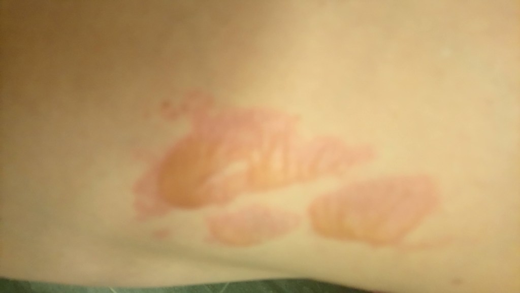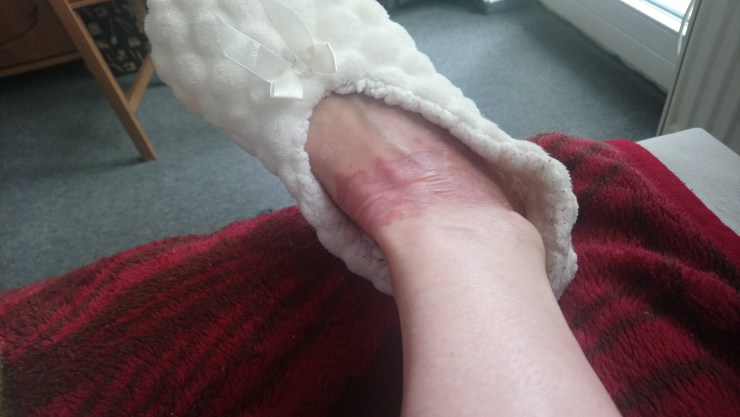 I dlatego właśnie, jak już najpierw tylko to przeczytałam, by zwilżyć go jednak tą wodą, to dałam go sobie zaraz pod pachy [jeszcze nawet super nie ogolone, hehe, bo uczynię to dziś, jak wezmę kąpiel 😉]. Ale jeszcze o tym w 100% nie wiedząc, bo coś mi się znowu tylko wydawało…, postanowiłam w takim razie zastosować go także na tą teraz już bliznę na stopie i to w dodatku obecnie nawet trochę bolącą, jak stoję… ze względu chyba na to, iż ta skóra się jednak w tym miejscu hm… marszczy (?). Postaram się tu Wam zaraz pokazać, co mam na myśli: